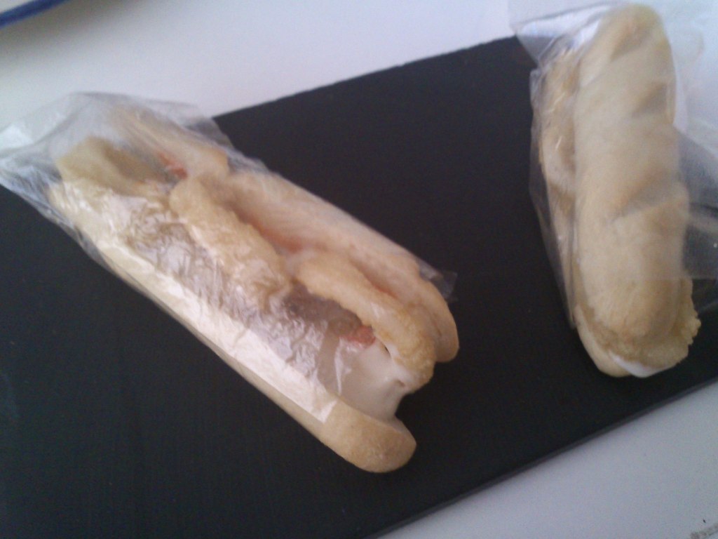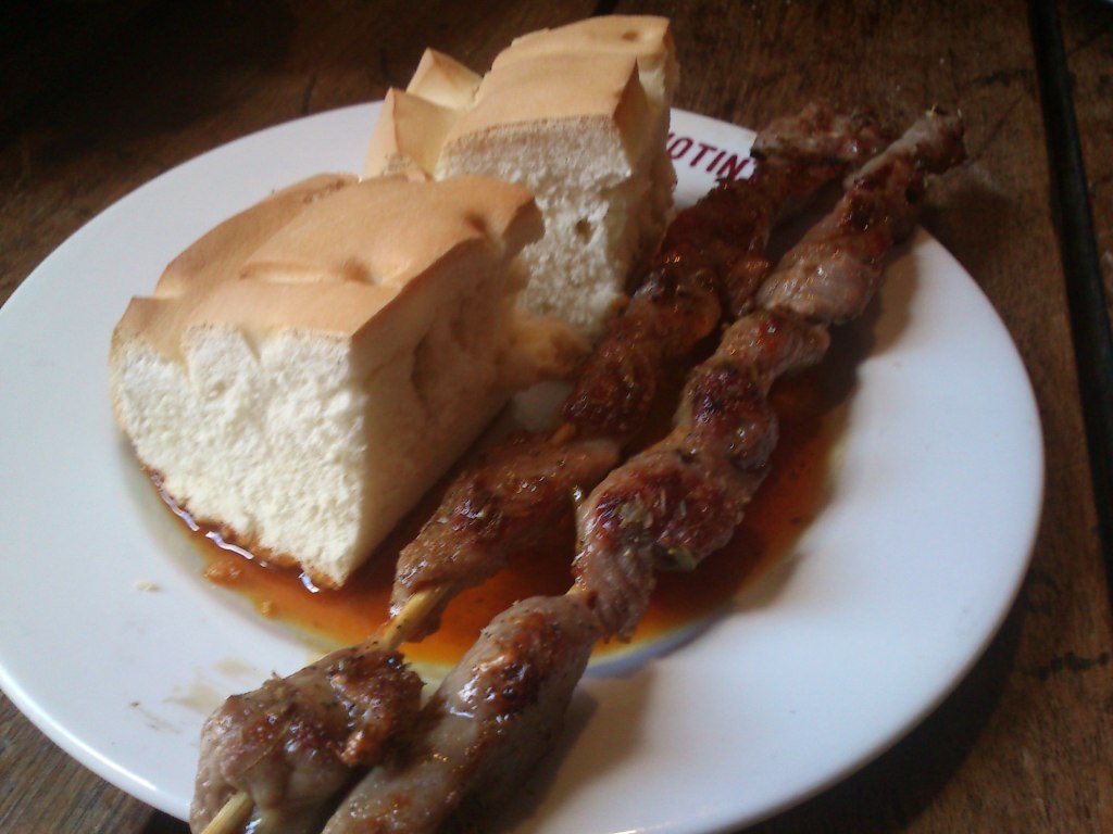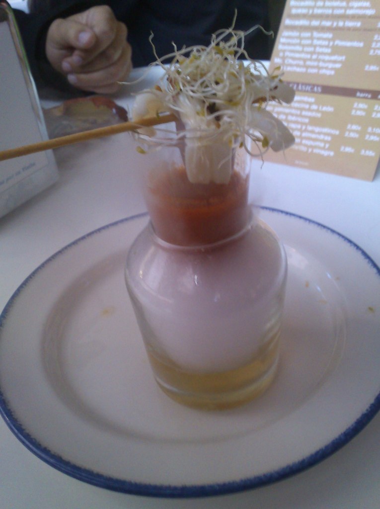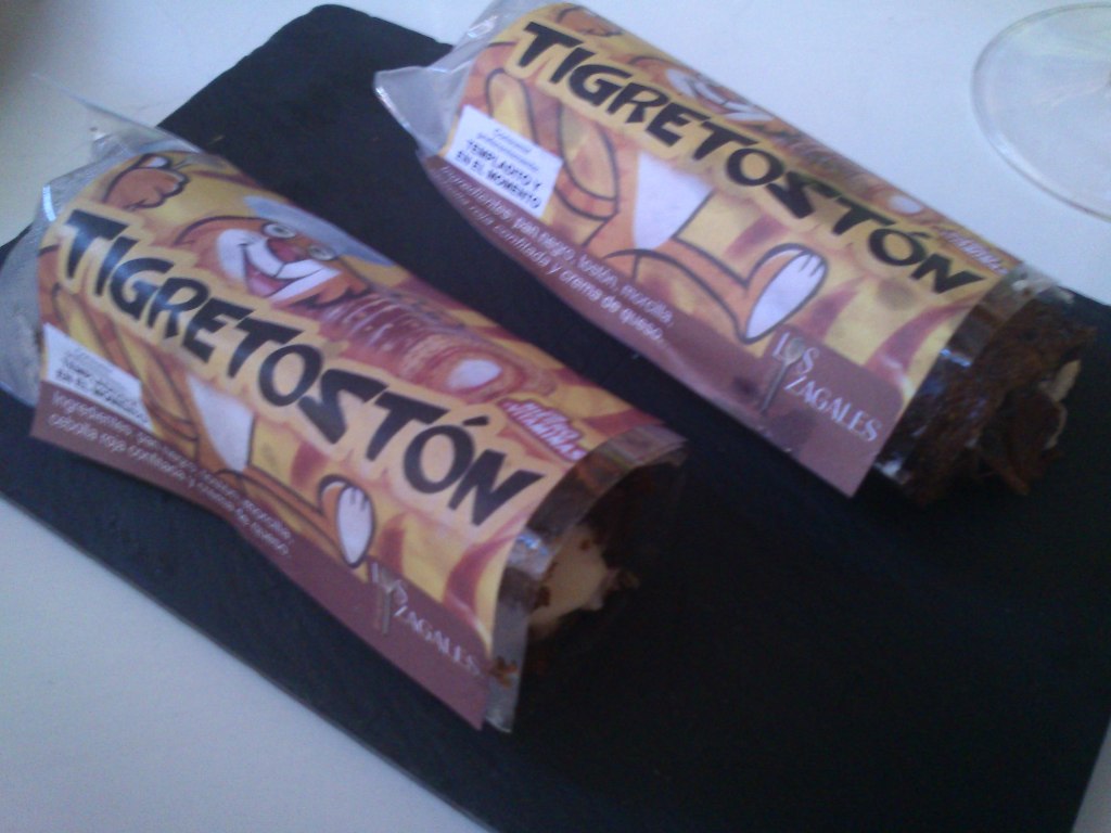 Por último nos acercamos Los Zagales, un restaurante con muy buena pinta, buena decoración y una amplia terraza con calentadores. Aquí pudimos disfrutar de varios pinchos creativos, el primero el Tigretostón, pan negro, relleno de crema de queso y cebolla roja confitada, morcilla y tostón. Como podéis ver en la foto, con una presentación original y delicioso, recordando los ingredientes del Trigretón. Fue el ganador del concurso nacional de tapas y pinchos de 2010. El otro es el Breadbag, baguetina brava de calamares recién hecha y envase comestible, homenaje, al local familiar que está al lado, conocido por el bocata de calamares, con alioli. También rico y original, y segundo premio en el concurso nacional de tapas 2011. Por último el Tierra Mar Aire, tapa más vanguardista del Concurso Nacional de tapas 2006, entre otros, y consiste en una combinación en un pequeño frasco, de vino verdejo sobre el que se coloca un vasito con un chipirón relleno de espárragos, cocochas de bacalao, pimiento de piquillo. Al servirse se vierte sobre el verdejo un trozo de hielo seco que calienta el chipirón con una fumata blanca que sirve de transmisor del vino al chipirón. Otros conocido pincho es Obama en la casa blanca, el Mc Churro, el jabón de Pato,…. Pinchos de alta calidad y ganadores de varios premisos, sirven de reclamo para este establecimiento. Los precios no son muy baratos, sobretodo en terraza, pero merece la pena visitarlo en cualquier ruta de pincheo por Valladolid. Los precios rodan desde los 2,75 a más de 3, pero teníamos servicio de camarero en la terraza, lo que encarece bastante.