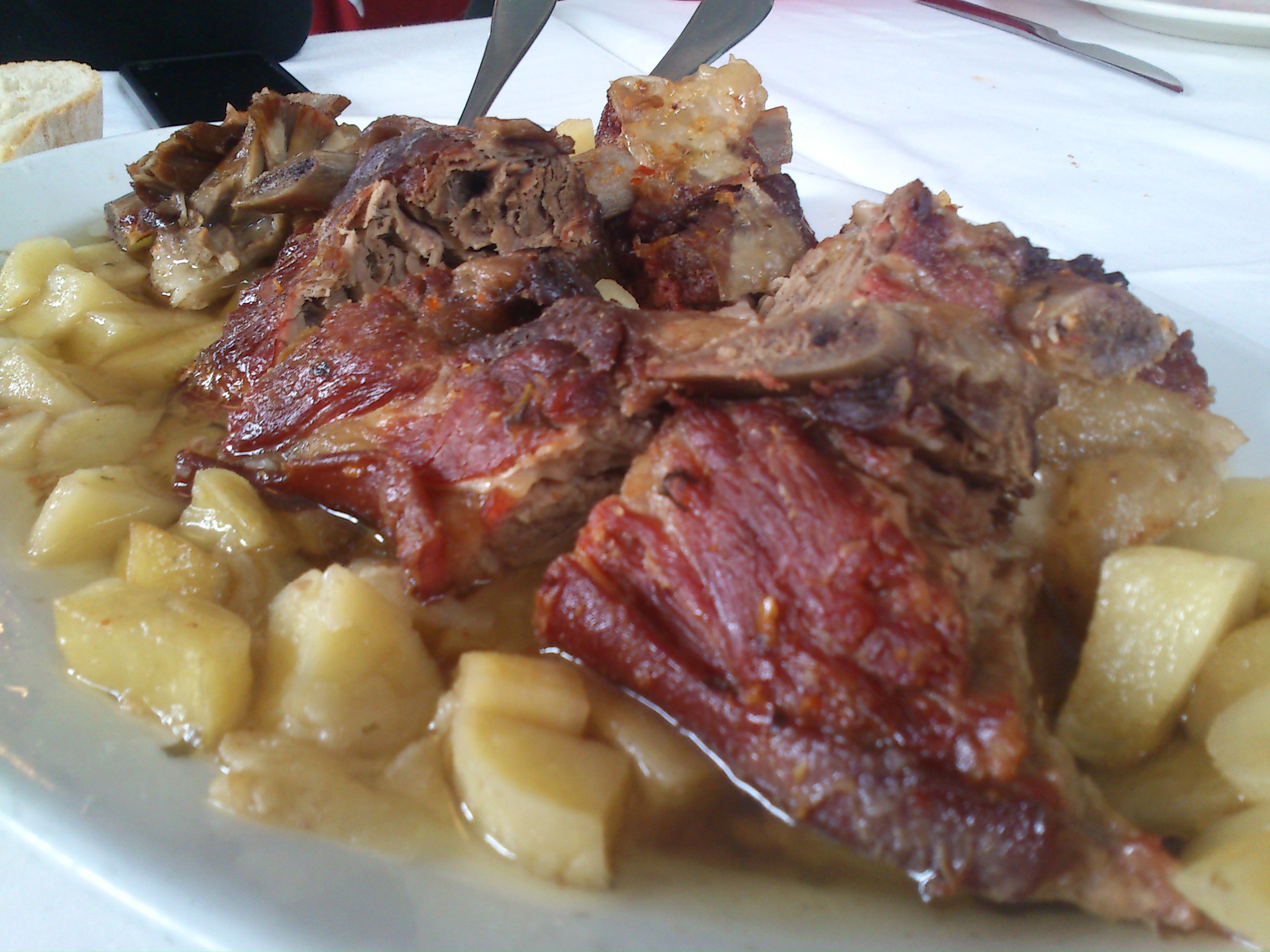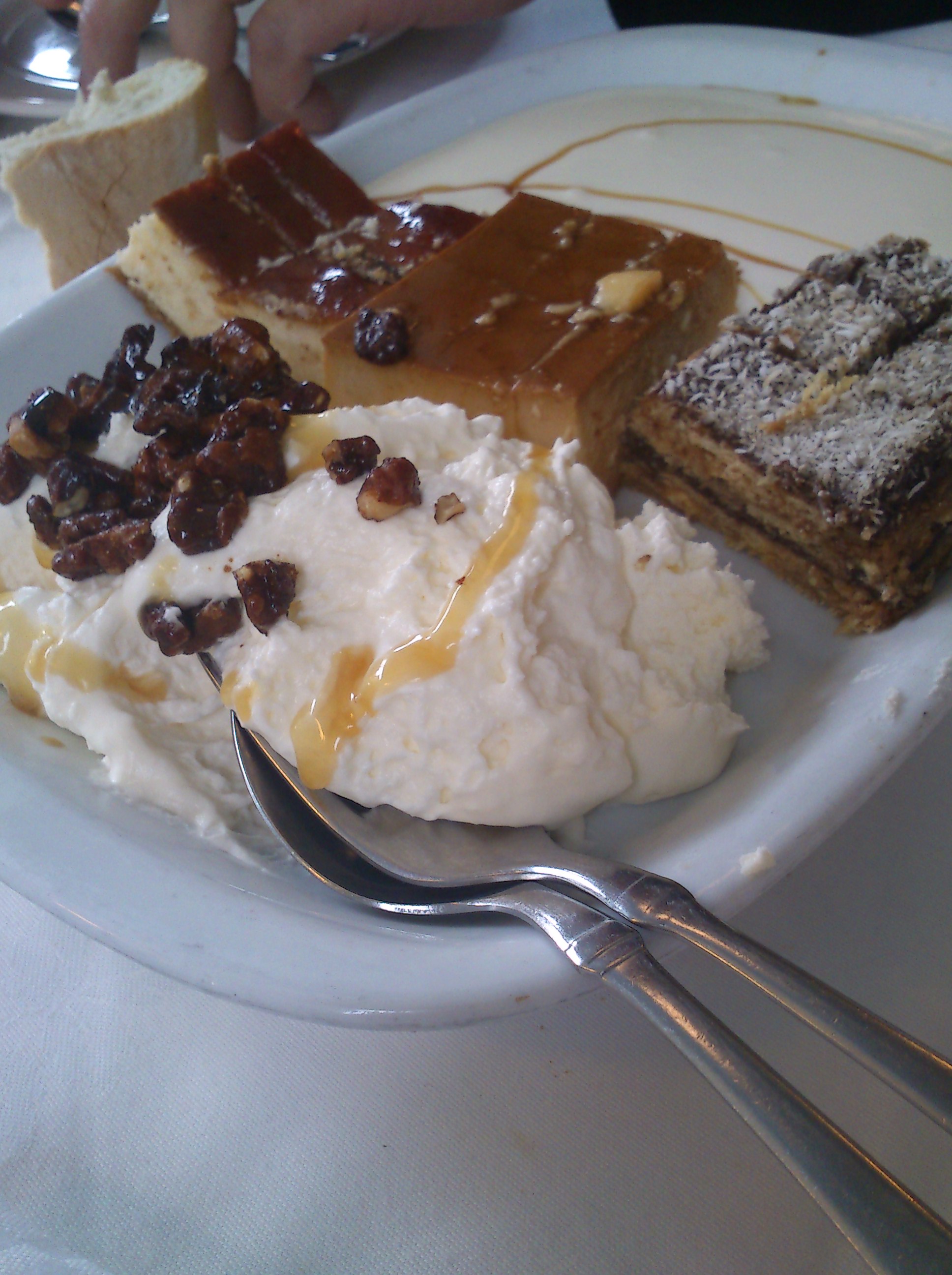 De postre te sirven un plato variado, con tarta de la abuela con coco, flan, requesón, nata, nueces garrapiñadas y alguna cosa más que no recuerdo, todo ello regado con un chorro de miel de la zona. Todo muy bueno, para que os hagáis una idea la nata sabia a nata de verdad, ni siquiera a la que puedas comprar en tarro, era un sabor intenso y fuerte, no apto para todos los públicos. Para beber tomamos agua y vino tinto de la casa, muy suave y fresco, ambos servidos en jarra de cristal, cafés y chupitos, todo ello por 21 € por cabeza.
