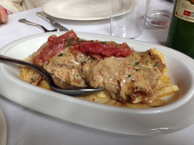 El cachopo de gochu, rico. Se trata de una rodaja de lomo de cerdo abierto en mariposa, relleno con pimiento, jamón y al menos dos tipos de quesos, un cabrales y otro que yo diría que era tipo Oscos. El sabor del cerdo es fuerte, me parecía que estaba adobado. Está rico, pero yo prefiero un cachopo de ternera, creo que tiene más sentido y los sabores combinan mejor. Viene acompañado de patatas.
