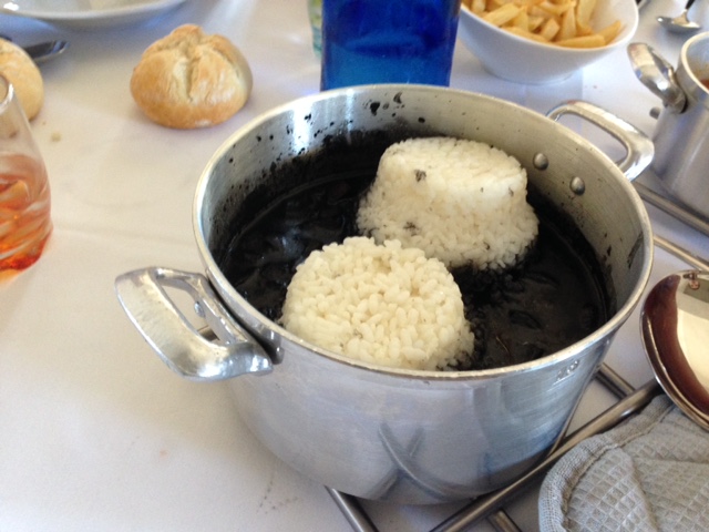 ¿De que platos os puedo hablar? Pues de entradas, una ensalada de pulpo y unas croquetas. La ensalada me pedía un aliño algo más “especial” que le diera más gracia. Las croquetas ricas, pero con poco sabor a jamón. De los platos principales yo comí hígado encebollado, muy rico aunque algo salado, algo que suele ocurrir en este tipo de platos. Las patatas que los acompañan caseras, muy ricas. También pude meter el tenedor en el arroz con calamares en su tinta, muy rico y tierno, pero no penséis en un arroz negro, es como el de tu madre, calamares con una montaña de arroz blanco. También a los callos, que estaban deliciosos, y la fabada, buena, pero tampoco espectacular, y por último, el plato que denominan duo de hamburguesas, dos hamburguesas de ternera asturiana ecológica, cebolla caramelizada, una con jamón ibérico de bellota y queso cheddar y la otra con cecina de Astorga y queso de cabra. Muy ricas.