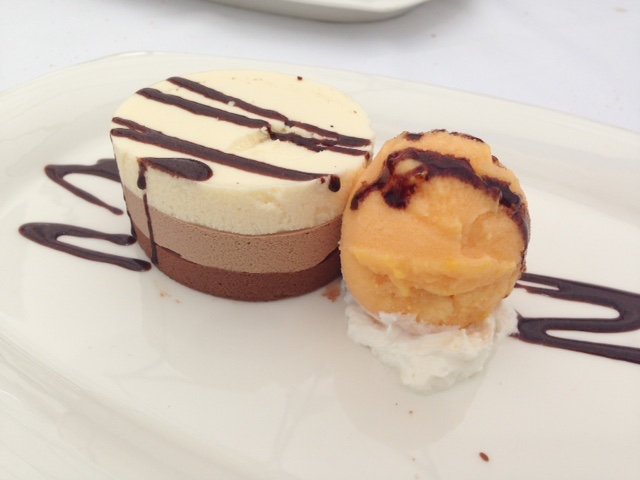 De postre una tarta de tres chocolates con helado de mandarina, muy rico, y tarta de turrón con helado de vainilla, también muy rico.