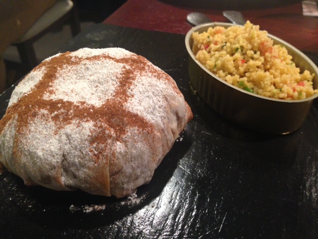 Continuamos con Pastela marroquí de pollo, frutos secos y ciruelas, cubierto de azúcar glass y canela. He de decir que soy muy dado a probar comida árabe, haya donde la veo, y en este caso no iba a ser menos. Esto es debido a que mi experiencia con este tipo de cocina es muy bueno, y me encantan los contrastes de sabores que ofrecen, tan diferentes a la comida tradicional. la pastela es una especie de empanada de masa filo, muy hojaldrada, donde se mezclan los sabores salados de la carne con el toque del azúcar y sobretodo de la canela. Puede resultar pesado de comer al no estar acostumbrado al sabor, pero merece la pena probarlo. Viene acompañado de cuscús.