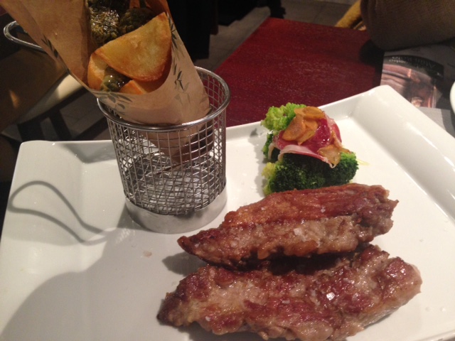 Para finalizar tomamos Pluma Ibérica de Bellota D.O. Valle de los Pedroches. Muy buena, se nota el sabor intenso que nos recuerda al jamón y la jugosidad que le da la grasa veteada en estos cortes. Viene acompañado de unas patatas, brócoli, pimiento y ajo frito en laminas. En resumen delicioso.