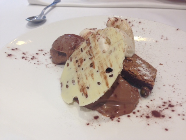 También probé el postre de chocolate con frutos secos, compuesto de helado de avellana, helado de chocolate, bizcocho de chocolate con pistachos, chocolate blanco con café lio y nueces fritas. Muy bueno, suena a postre casero una noche de depresión, en el que asaltas la nevera y el bote de helado.