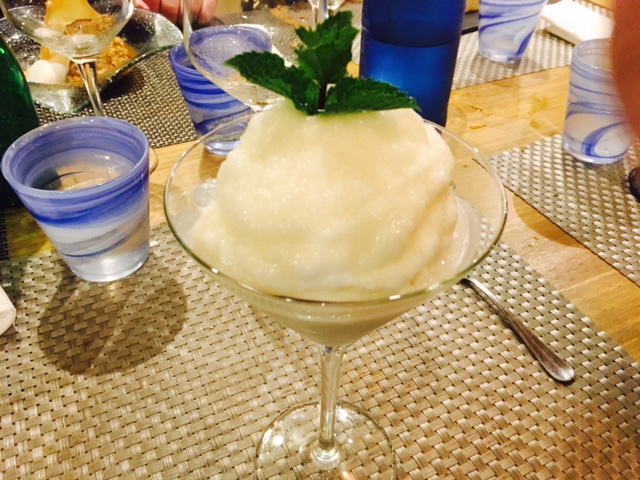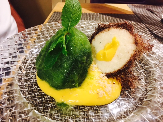 De postre, personalmente, tome el sorbete de limón al cava, muy rico y refrescante, aunque también pude probar la trata de queso, la pasión coco y menta y el bizcocho roto de avellanas y coco. No me entusiasmaron, aunque entre ellos destaca sin duda la pasión coco, tanto por su original y cuidada presentación, como por el intenso sabor que ofrece.