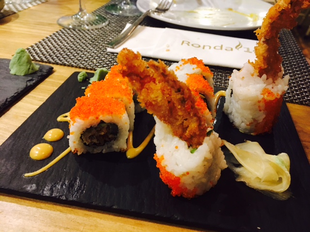 La ruta consistió en ocho platos que consistieron en; el tiradito de corvina sobre crema de ají panca (el aji es lo que aquí conocemos por guindilla); el roll de salmón acevichado; el roll de cangrejo de caparazón blando con salsa de curry; las gyozas de anticucho con aji limo y cilantro (El Anticucho es corazón de ternera marinado y a la brasa, que no os asuste, dejar los prejuicios fuera, si no os lo dicen no os enteráis, y esta delicioso); el roll de mar y montaña; Ebi Furay Roll (langostino); el roll de quinoa y aji amarillo; el nigiri- hamburguesa de wagyu, rocoto y azul (el rocoto es un tipo de aji); y para rematar las patatas rellenas de carne estofada.