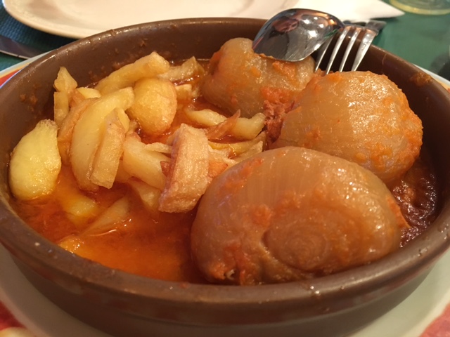De picoteo, probamos los calamares fritos, los pimientos y la matachana. Todo correcto, pimientos y matachana, acompañados de patatas fritas. Tampoco es que se tratase de platos muy complejos, pero siempre es un buen indicador de la cocina de un sitio, los más clásicos de picoteo o los menús del día. Como algo diferente, pude probar las cebollas rellenas. Una ración curiosa para compartir acompañadas de patatas. Muy ricas, aunque he de decir que no suele coincidir que las pida muy a menudo.
