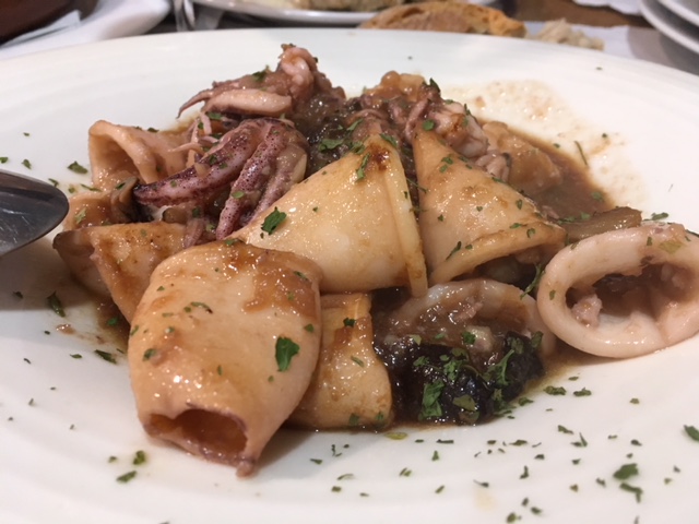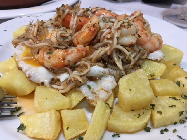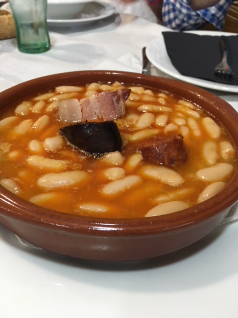 Éramos tres adultos y dos niños, y optamos por pedir el menú de festivo, de 15 € y unos chipirones afogaos, unos huevos rotos con gambas y gulas y una de secreto ibérico. Íbamos a quedarnos con el menú y dos raciones, pero nos dijeron que seria poco,… falso. El menú era fabada y solomillo de cerdo. De sabor bien ambos platos. En cuanto a las raciones, también rico, aunque nada espectacular. Lo más rico quizá los huevo rotos, y lo peor la manía que tienen en algunos sitios de ponerle la crema de vinagre de Módena a la carne, algo que yo personalmente no entiendo. Si esta bien porque viene acompañado de patatas y de tomate a la plancha y manzana que siempre acompaña bien a la carne de cerdo.