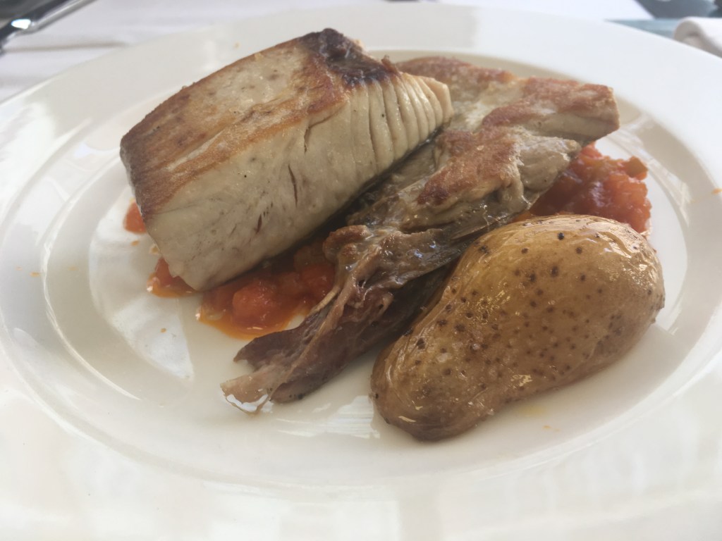 Local amplio con un comedor sencillo, ofrece en su carta comida clásica en la que encontrar entrantes clásicos, arroces variados, carnes como solomillo, presa o entrecortada y pesados con bacalao, merluza o pixín, sin olvidar la opción de menú diario. Nosotros optamos por el menú diario del sábado, por 18 euros. De primero siempre un aperitivo de la casa, detalle que nunca falta en sus servicios. En este caso un paté de garbanzos, bastante rico, acompañado con unas tostadas de pan crujiente deliciosas. Para comenzar y elegir, sopa y cocido de garbanzos o arroz con pitu. Yo opté por el arroz, y no me convenció mucho. Venia con el pollo deshuesado y el sabor era para mi gusto demasiado al sofrito de verduras. El punto para mí demasiado hecho. De Segundo tres opciones, tronco de bonito en escabeche con brotes verdes, o tira de ventresca con pisto, o una tercera opción, solomillo con crema de calabaza. Yo opté por el solomillo, de cerdo, poco hecho para mi gusto y sin mucha novedad. El punto de la Ventresca tampoco estaba logrado y algún plato llegó con ella poco hecha y hubo que devolverlo. De postre opté por la tarta de chocolate, rica y con un toque a avellana.