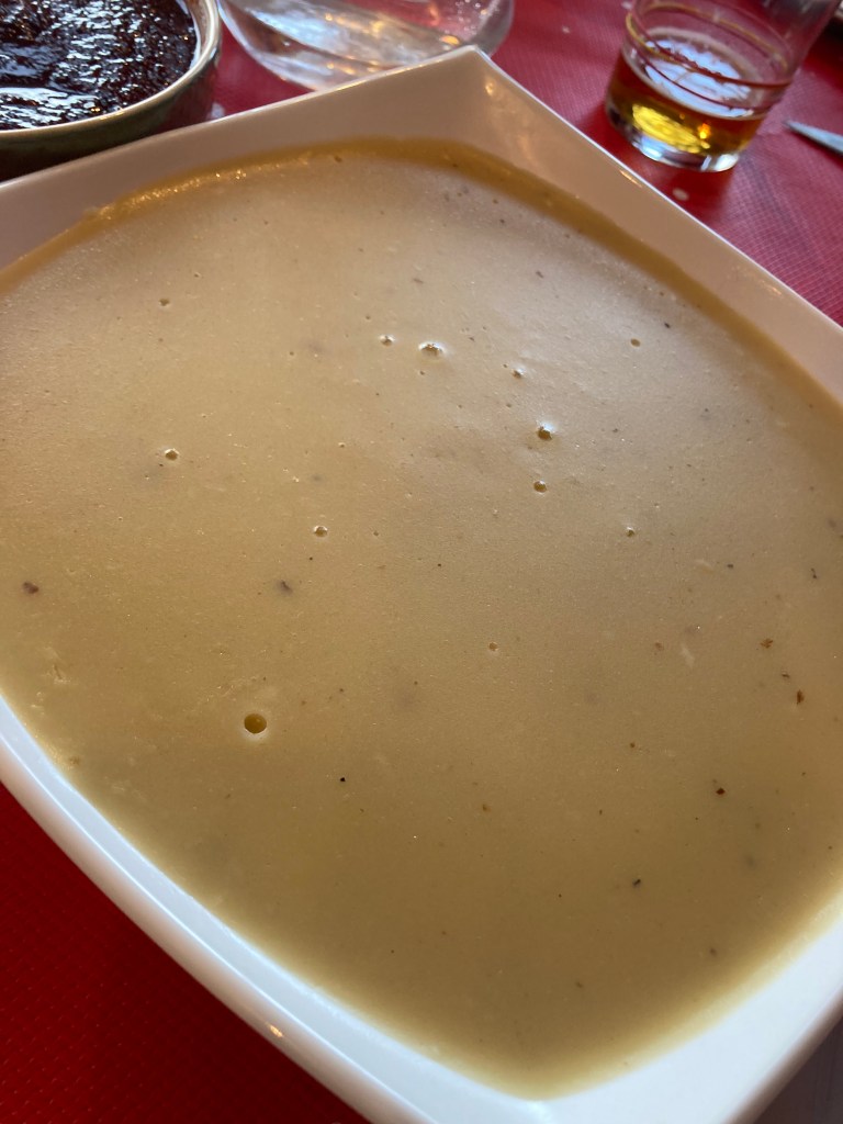 La salsa gravy es una salsa que se elaborada con los jugos de la cocción de la carne a la que va a acompañar, y que normalmente, se espesada con un roux de mantequilla. ¿Recordáis ese momento de una salsera bañando el puré de patatas? pues eso es gravy. Para comenzar necesitamos el jugo que, en este caso, obtenemos de la cocción de los huesos del pavo junto con verduras, ya que el pavo lo relleno y lo sirvo deshuesado (ya os explicaré). Si no, cualquier jugo de carne serviría, siempre en consonancia con la carne a al que va a acompañar. Para la cocción de las carcasas recordad que, sean del pavo o compréis unas de pollo, podéis añadir unas alitas y verduras al gusto, y para que quede más sabroso, tostar las carcasas previamente en el horno, hasta que cojan color. Posteriormente lo pasaremos a la cazuela con agua para cocer. Después de esto, la salsa es muy sencilla de hacer, simplemente necesitamos, como para una bechamel, derretir la mantequilla en una sartén u olla, a la que añadimos la harina, y mezclaremos hasta que esta se tueste. A continuación, añadiremos el caldo o jugo poco a poco y mezclando bien. Después de cinco minutos de cocción la salsa habrá espesado y solo nos quedará sazonar al gusto. Yo personalmente con sal y pimienta es de sobra, pero acepta cualquier hierva aromática o incluso salsa worcestershire.