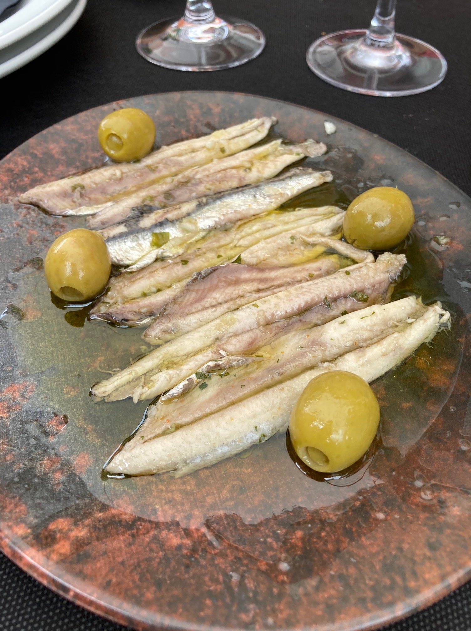 En esta visita pude probar primero un aperitivo gentileza de la casa, unos boquerones en vinagre muy ricos. De entrante tomamos la ensalada templada la solana, un mezclum de lechugas con brotes de soja y una variopinta mezcla de mariscos, con gambitas, mejillones, almejas,… y setas; no triunfo, resultaba una mezcla un poco extraña y los sabores no pegaban para nada. De plato principal solomillo al foie y Pedro Ximenez, acompañado de patatas fritas y cebolla caramelizada. Una buena ración al punto perfecto, carne tierna y acompañamiento no menos delicioso. En general raciones amplias y correctas.