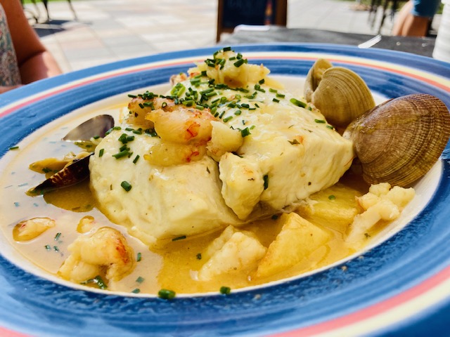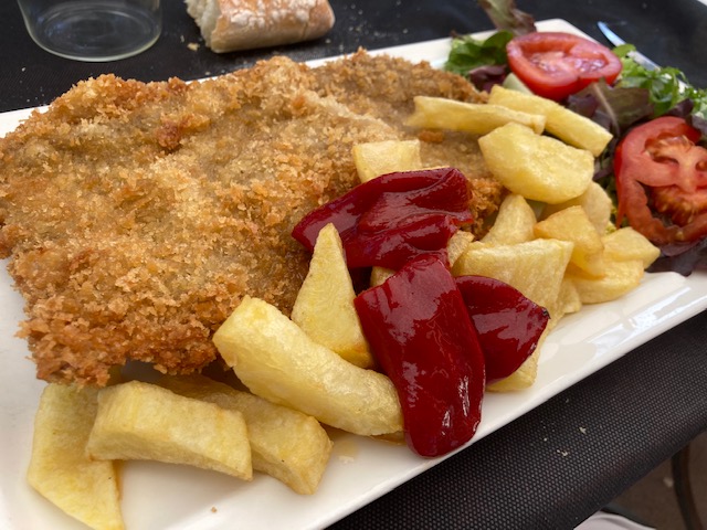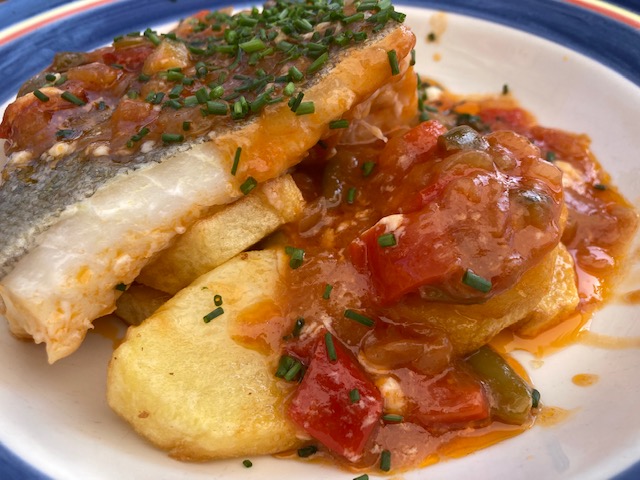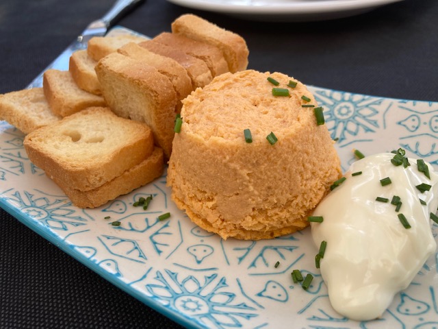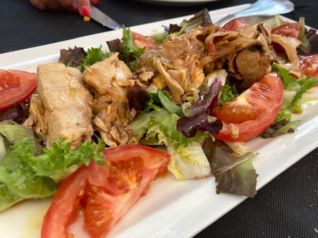 En esta ocasión el aperitivo detalle de la casa un poco de pastel de cabracho muy rico para abrir boca. Los calamares frescos de entrante muy buenos, y la ensalada de bonito en escabeche abundante y rica. En esta visita probé el cachopo que hacia mucho que no comía uno, y si bien estaba bueno y es abundante no me destaco especialmente sobre otros que he tenido la ocasión de comer en otros sitios. Es correcto pero no me parece destacable. El bacalao con pisto y la merluza, abundante y buenas.