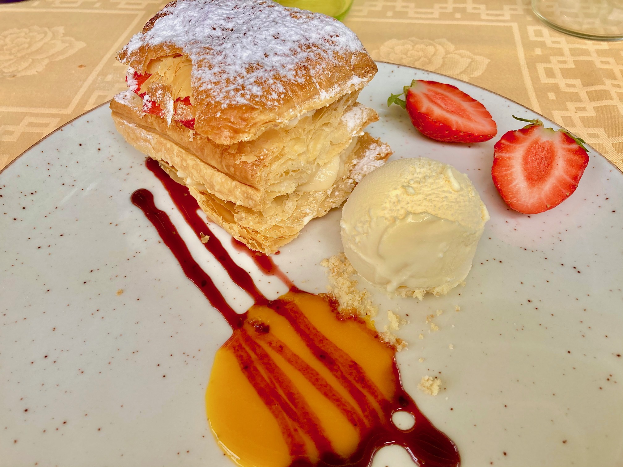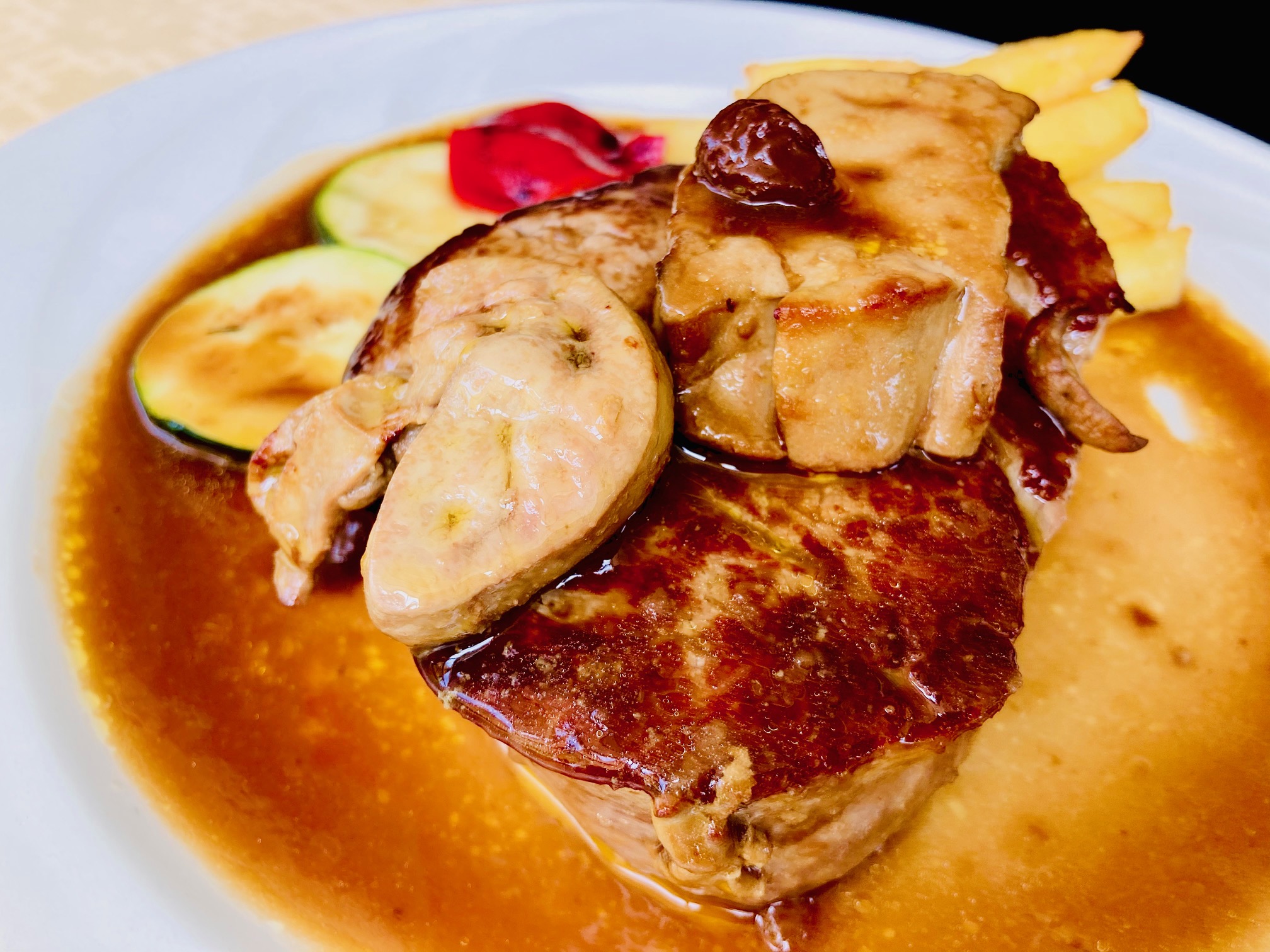 En nuestra visita empezamos con un pastel de cabracho detalle de la casa. Suave y rico de sabor. Continuamos con todo un clásico como son las frituras variadas. Las croquetas muy cremosas pero algo flojas de sabor, los calamares correctos y lo mejor las gamas a la gabardina, muy sabrosas y grandes. Algunas personas pidieron carne, entrecot y solomillo al punto, pero no estaba muy logrado, para nuestro gusto demasiado pasadas, y en este tipo de carnes el punto lo es todo. El solomillo, una buena ración, sin escatimar en foie. El salpicón también muy abundante, y muy bueno de sabor. De postre una milhojas de fresas con crema y helado de vainilla. Correcto, pero nada destacable. Para beber sidra DOP Menéndez Ecológica y agua. Cuando pides sidra, no te especifican que es ecológica y luego en el precio se nota, ya que cuesta 4 € la botella.