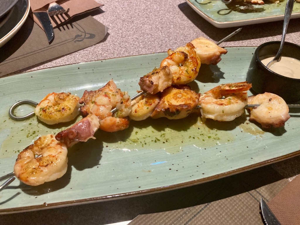 En esta visita pudimos probar la brocheta de langostinos y pulpo a la parrilla, bastante rica, acompañada de una salsa alioli que le va genial. La tosta de cecina y queso de cabra muy buena también. En cuanto a la carne el chuletón, rico. Carne de ganadería gallega propia, ya que son los mismos propietarios que el local vecino y del que ya os hablamos hace tiempo, el mesón pulpería Tierras Gallegas. La parrillada de verduras rica y variada. Pude probar también las costillas, que fue lo que menos me dio, poco jugosas y poca chicha.