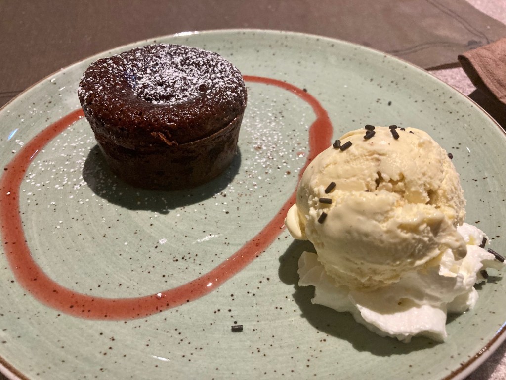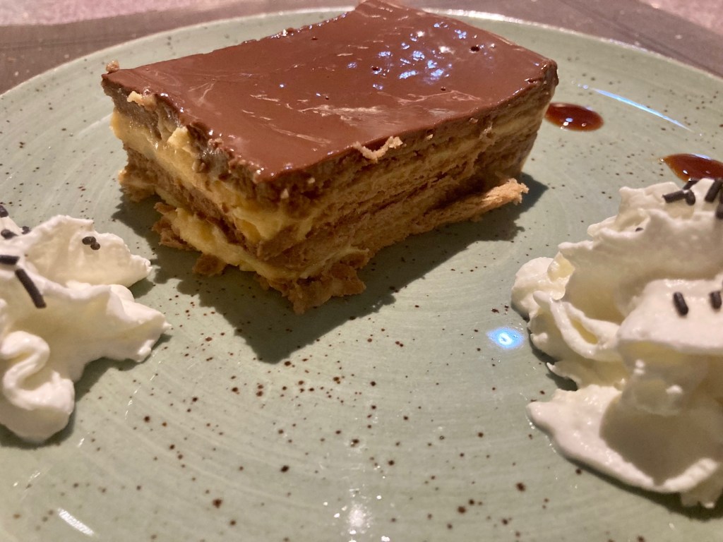 De postre probé la tarta de la abuela, muy rica. Para beber Ribera de Duero Tinto, Ébano y agua. El servicio muy rápido. El precio fue de aproximadamente unos 20 € por cabeza. Todo rico, y bien de precio, pero no me cautivó por nada particularmente, porque creo que le falta algo de identidad. Es un local montado tipo cervecería de bodega de Estrella Galicia y quizá sumado al tamaño le da un aspecto impersonal o de franquicia. Dos llambiotaes