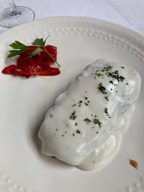 Nosotros optamos en nuestra visita por el menú, compuesto de tres platos, postre, pan y vino, todos ellos, platos que podemos degustar en su carta. Empezamos con unas setas de temporada y jamón ibérico. Una ración abundante para compartir, muy ricas y una combinación de éxito. Seguimos con crema de nécoras, muy buena, con un sabor delicioso. Por ultimo optamos por la berenjena rellena de marisco. Muy rica, si bien es cierto que la bechamel podría tapar un poco el sabor de la propia berenjena. Para beber optamos por un D.O. Rueda, Verdejo de bodegas Valdecuevas Flor Innata, muy fresco y aromático. De postre pude probar el arroz con leche, correcto, la trata de queso con arándanos (tipo horno) y flan casero con arándanos, todos ellos ricos. El precio de menú fue de 25 € por persona.