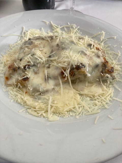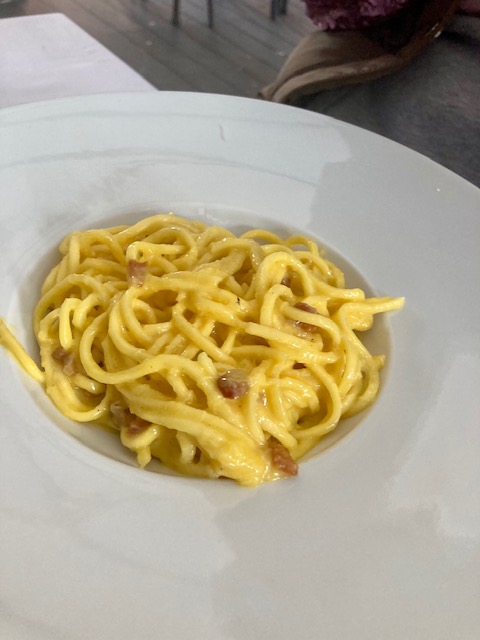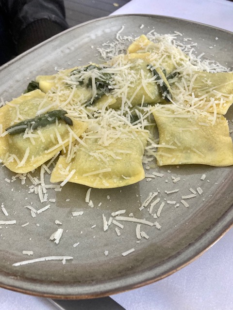Pude probar un montón de cosas, empezando por un entrante típico de la Romagna, la Piadina Porchetta, un pan plano con carne de cerdo deshuesada asada al horno. Continuamos con unos espagueti a la carbonara auténticos, sin nata ni nada por el estilo, con su parmesano, su huevo y su panceta; un sabor fantástico y terminado en la mesa con el toque de pimienta negra. Seguimos con los tagliatelle con mantequilla y trufa, servida y rallada en la mesa, abundante y sabor intenso, imprescindible para los amantes de este hongo. Si esto fuera poco, tenemos la lasagna de boletus, realmente deliciosa, con un intenso sabor, muy bueno, con su queso y su bechamel. Seguimos con los ravioli de requesón y espinacas, deliciosos con un toque de salvia fantástico. Para terminar la pizza contadina con queso Burrata, rúcula y jamón de Parma. Masa fina tipo romagna y sabor realmente delicioso.