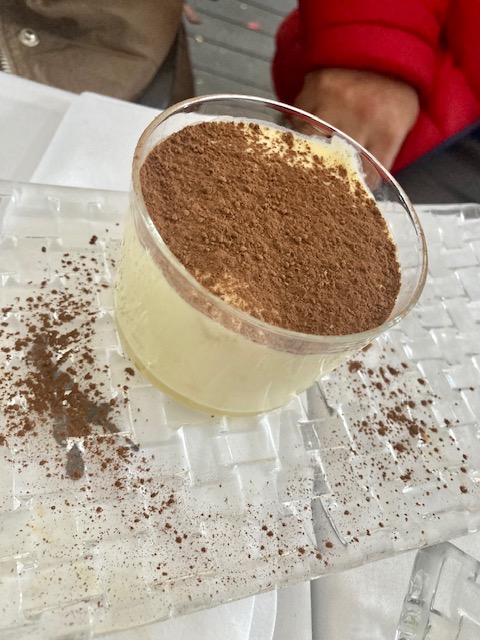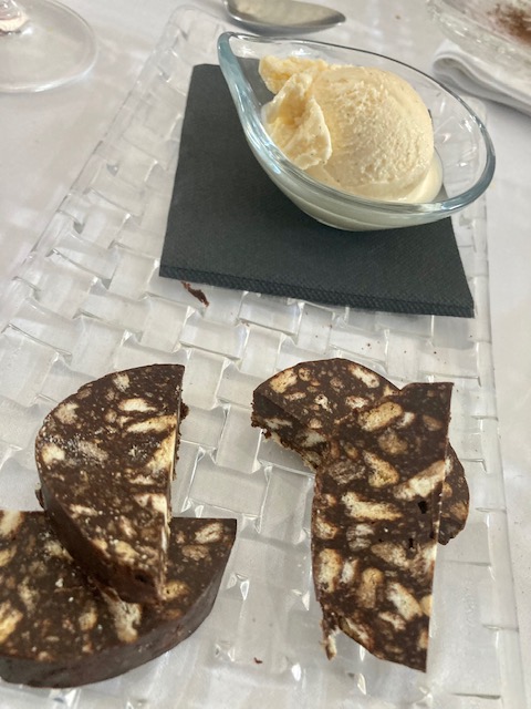 De postre pedimos tres para poder compartir entre todos. Empezamos con el tiramisú, suave y cremoso, muy bueno, la morcilla de chocolate, un trampantojo que visualmente parece una morcilla pero es de chocolate con frutos secos y acompañado de helado de vainilla, y por último el que a mi personalmente más me gusto, la torrija de panettone, donde destaca el sabor de panettone pero con la cremosidad y jugosidad de una torrija, realmente bueno. Para beber nos recomendaron un tinto de Cerdeña, un Cannonau di Sardegna I Fiori realmente rico.