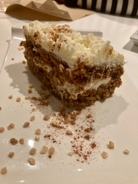 Con esta cantidad, quedamos más que satisfechos, pero no pudimos dejar pasar la ocasión de probar alguno de sus postres caseros y nos pedimos la tarta de zanahoria y la de queso para probarlas. Ambas muy buenas. La de queso tipo New York Cheese Cake, fina y con una mermelada muy rica, y la de zanahoria, muy jugosa y delicioso sabor a las especias características.