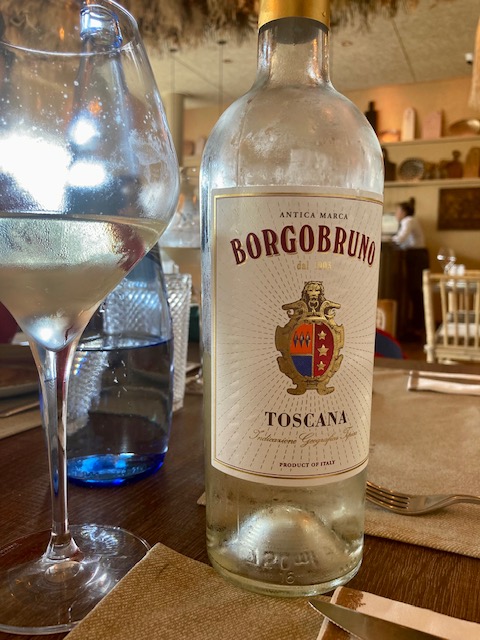 Para beber un afrutado y rico Borgobruno, blanco de Toscana y agua.