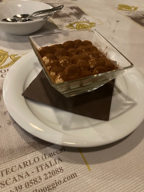 Vino de elaboración propia con las viñas de la zona de Montecarlo y una cocina deliciosa. Ravioli Pecorino e Pere; ravioli con queso pecorino y pera; Coniglio all`etrusca; guiso conejo a la etrusca con aceitunas. Tordolli alla luchesse; pasta fresca rellena de carne, mortadela y queso, típico de la ciudad de Lucca y muy consumido en la región toscana. Ravioli provola e speck; pasta rellena con queso y con jamón tipo speck, típico de la zona tirolesa de Italia. Maccheroni all`anatra; pasta fresca con pato. Y como no un auténtico tiramisú… delicioso, y unos precios fabulosos, solo el conejo llegaba a los 10 €.
