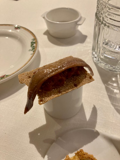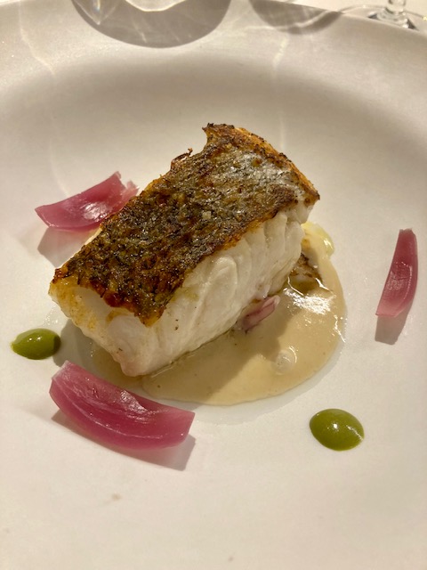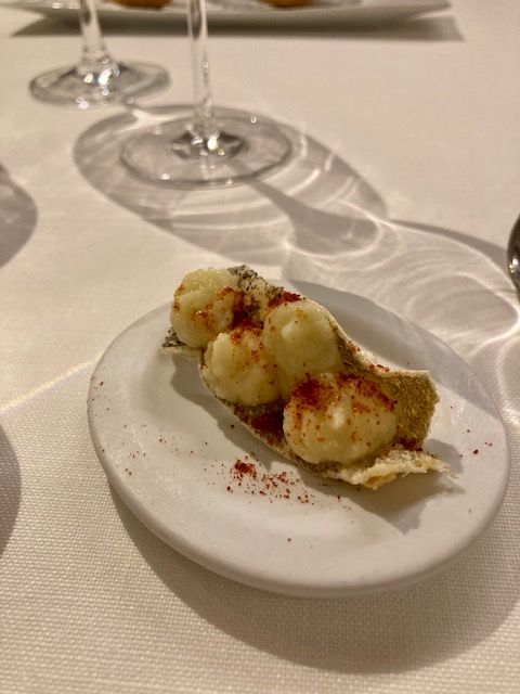 El menú comienza con unos aperitivos variados, como, por ejemplo, el steak tartar de vaca tudanca y anchoa de Santoña, el aperitivo de bacalao, De primero tenemos una ensalada de bacalao, setas, pimientos y pil pil. Una combinación templada muy rica, donde contrastan los amargos de la ensalada con el pil pil, el toque de la seta y el buen punto del bacalao. Seguimos con el pescado según mercado, una merluza con un punto fantástico y una y cebolla encurtida que contrastaba muy bien con la crema que la acompañaba. Seguimos con la ternera en su jugo, con zanahoria y cebolleta ecológica, espectacular. El postre, un auténtico broche de oro, torrija de pan caramelizada con helado de jengibre; un sabor excepcional con una combinación buenísima.
