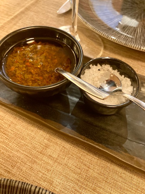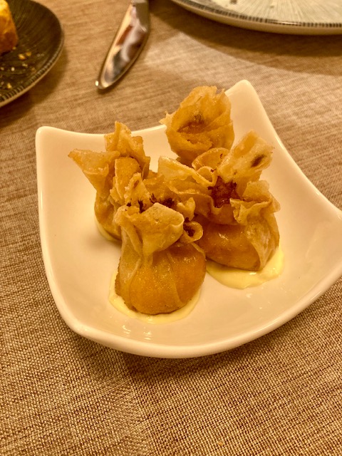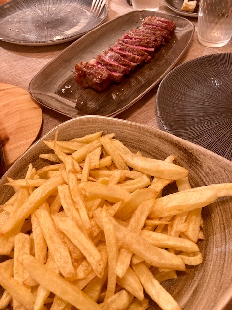 Como veis, aunque es una carta eminentemente cárnica, hay opciones para todos los gustos, incluso vegetarianas. Nosotros quisimos compartir y optamos por pedir tres cortes diferentes para los cuatro, ojo de bife (lomo alto), picaña black angus y vacío black angus . Para empezar nos pusieron un aperitivo de la casa delicioso; una especie de saquito de masa brisé con gambas y una mahonesa de wasabi en la base. La carne es servida con patatas y con una plancha para terminar de hacerla. La plancha no aguanta mucho el calor por lo que recomiendo poner «toda la carne en el asador» e ir comiendo. Si eres de los que les gusta la carne muy pasada quizá merezca la pena que lo pidas en cocina directamente. Todas las carnes excepcionales, aunque me quedaría con la picaña, pero todas ellas de diez. El chimichurri casero delicioso, muy bueno.