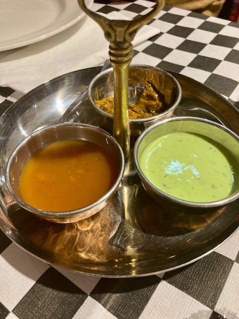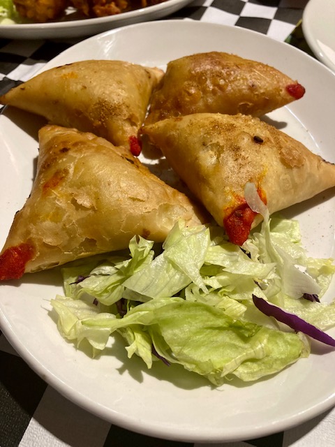 Con los entrantes que podéis pedir para probar y compartir, empezamos con algo muy típico; las samosas. Se trata de unas empanadillas de harina de trigo finas, con forma triangular, y rellenas de carne o verduras especiadas, y fritas en aceite vegetal; En esta ocasión pudimos probar las samosas de pollo, muy ricas, con el toque de especias y acompañadas de la salsa de mango o de menta, deliciosas.