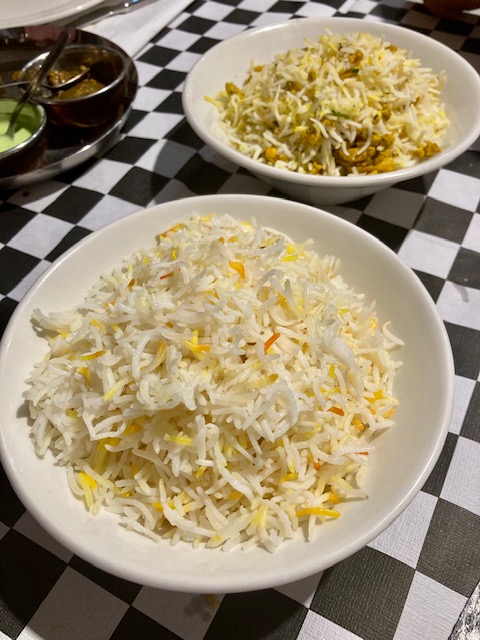 Para acompañar los platos principales es aconsejable pedir un arroz basmati para que se empape bien de las salsas. En carta tienen diferentes opciones, y nosotros pedimos el egg fried, es decir con huevo frito, y el Pilau, aromatizado con mantequilla y colorante. En ambos casos nada destacable en cuanto a sabor o diferencias entre ellos, un arroz blanco sin más.