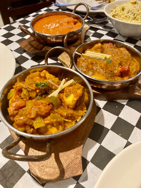 Otro clásico es el pollo Tandoori, preparado con pollo macerado en garam masala (una mezcla de especias como pimientas, nuez moscada y clavo) con ajo, jengibre y comino, y untado con pimentón (que le da un color rojo intenso, para después cocinarlo brevemente en el tandoor. En la carta también tenéis las gambas Tandoori, marinadas en especias y untados con pimentón y cocinados en el horno tandoor. Por supuesto que no falte el pollo al Curry (la palabra proviene del Tamil, kari, salsa) de Pakistán, preparado con pollo deshuesado, en salsa curry de garam masala, cúrcuma, jengibre y ajo, rociado con coco rallado, cacahuates, almendras y pasas, servido con chutney de mango verde.