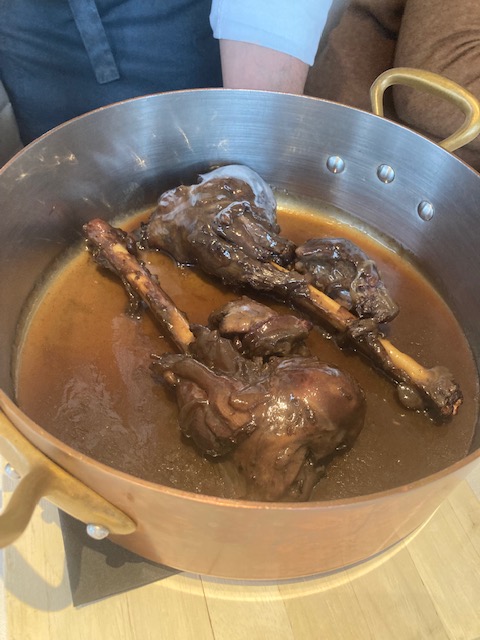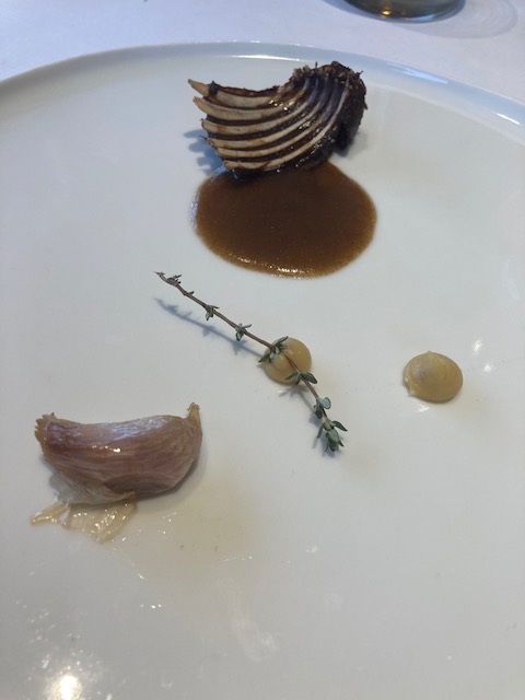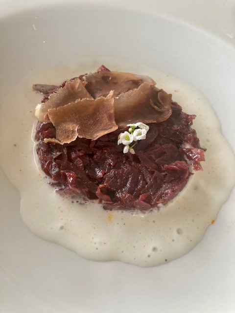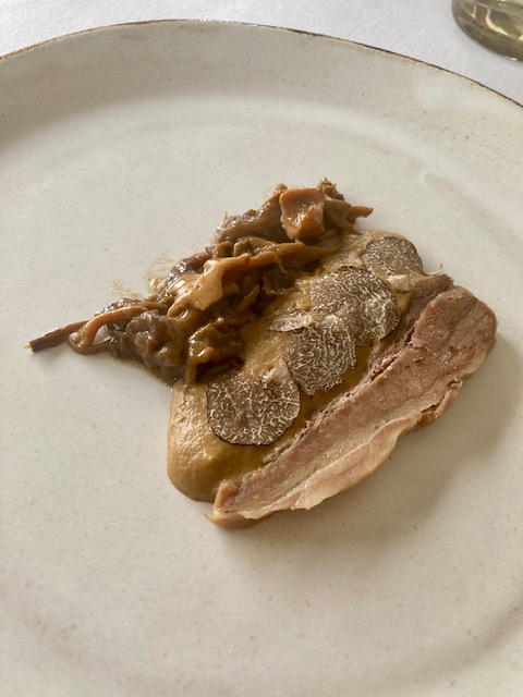 La jornada empieza con un caldo intenso de ave para entonar el cuerpo, con un sabor excepcional. El menú degustación comenzó con un éclair, un salazón y unas croquetas de paloma bravía. Todo ello delicioso, pero sin duda el éclair es espectacular, la explosión de sabor es única, tónica general en todo el menú. Continuamos con una ensalada de pato azulón, un trozo de carne acompañado de rillet servido en la propia mesa (viva el pato) Continuamos con un escabeche de Pichón de Tierra de Campos, muy rico y suave. A continuación, un plato que me fascinó especialmente, setas, trufa y jabalí, compuesto por un poco de panceta de jabalí, una mousse de boletus con trufa laminada y unas angulas de monte y rebozuelos; una locura absoluta. Seguimos con lombarda, ciervo y mantequilla de oveja, una lombarda sabrosa y exquisita, que con la mantequilla de oveja resulta una combinación de diez. El siguiente plato es una legumbre de Tierra de Campos, en esta ocasión las alubias de Saldaña con liebre, un plato redondo, sabroso y reconfortante. Continuamos con la liebre, en este caso frita, acompañada de ajo, muy buena. Continuamos con Jarrete de corzo, acompañado de un finísimo puré de patata, presentado primeramente y montado en la mesa, de cine. Llegamos al pre-postre, perdiz brava con pera de invierno, una combinación dulce-salada de escándalo y que personalmente me encanta. Para finalizar, los postres, leche de oveja castellana, compuesto por una mus, una leche quemada y unas lascas de queso zamorano, un auténtico placer para los amantes del queso, y un chocolate y frambuesa, compuesto por un bizcocho de chocolate negro y un delicioso helado de frambuesa. Como final, un petit four de unas pastas caseras muy buenas, presentadas en una reproducción de un tradicional palomar de Tierra de Campos. Todo el menú se acompaña de dos tipos de pan, torta de aceite y hogaza de pan bregado, así como agua Km O.