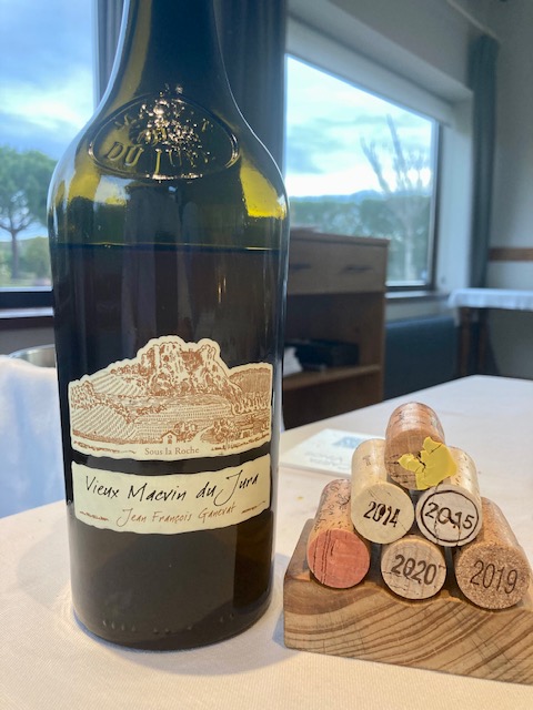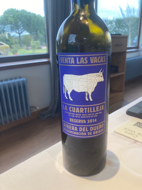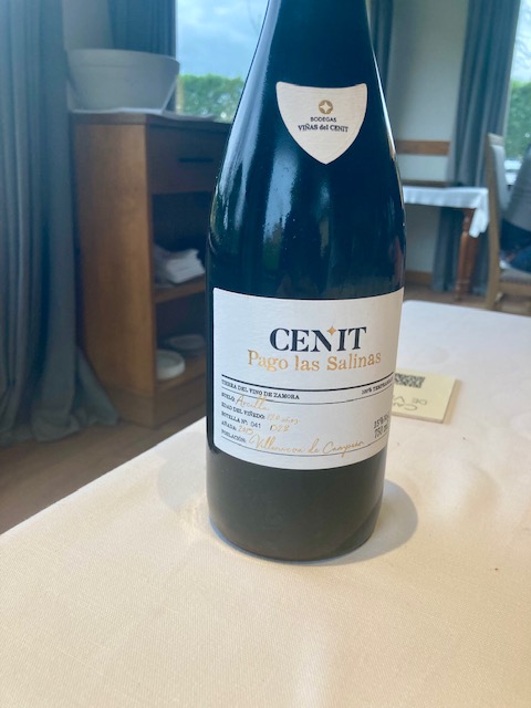 En cuanto a los vinos, pudimos disfrutar del consejo del sumiller de la casa Adrián Ferrón, que de una forma fantástica nos acompañó con una selección espectacular y progresiva de vinos a lo largo de toda la comida. Empezamos con un blanco de Parajes del Infierno, El Judas, un vino de Bodega Barco del Corneta, con uva Viura, cultivada en Villanueva de Duero, de agricultura ecológica. Se prensa con su raspón y se cría sobre sus lías durante 12 meses; muy suave y refrescante, ¡peligroso! Continuamos con un Ribera de Duero de la bodega Dehesa de Montelaguna, una edición limitada de El Hache; fantástico. El siguiente vino correspondió a un Ribera de Duero, Goyo García Viadero, un tempranillo realmente bueno. Continuamos con un Cenit Pago las Salinas, otro tempranillo, esta vez de Tierra de Zamora, para terminar con un Ribera de Duero, tempranillo, reserva de 2014, La Cuartilleja de Venta las Vacas, con un sabor mucho más potente e intenso que los anteriores, de la bodega Uvas Felices. Con el postre disfrutamos de un Vieux Macvin du Jura, algo que nunca había probado, procedente de Francia, de Cotes du Jura, elaborado por Jean Francois Ganeva, un vino de licor dulce, con fuerte aroma a orujo, debido a su elaboración, en la que al mosto de uva concentrado por ebullición se le añade aguardiente de orujo; sencillamente delicioso.