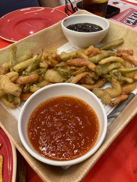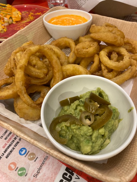 Empezamos por unas tempura de verduras «al estilo japonés con salsa sweet chili y tentsuyu». Estilo japonés serian, parecidas ya menos. La variedad de verduras, un tanto escasa, cebolla, zanahoria y pimiento. Seguimos con unos nachos, gratinados con queso guacamole y pico de gallo, bien, correctos. Continuamos con unos aros de cebolla bastante corrientes, unas tiras de pollo en crujiente de panko y marinadas en leche de coco y curry rojo y acompañadas de salsa Thai de plátano, que es lo mismo que decirte, unas tiras de pollo rebozadas, que ojo estaban bien, pero le sobraban apellidos. Por último unas buffalo wings, alitas de pollo marinadas en salsa de jalapeños y barbacoa de bourbon, que es lo mismo que decirte unas alitas de pollo fritas. En general mucha descripción y mucho rollo para cosas mas bien normales y corrientes, que no por ello malas, ojo, estaba todo rico.