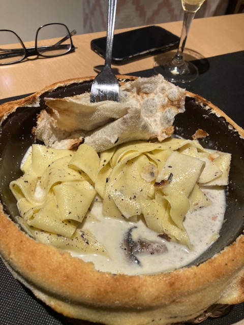 Nosotros optamos por compartir varias cosas y así probar un poco de todo. Como gentileza de la casa unas aceitunas verdes y negras aliñadas. Empezamos con una especialidad de la casa, el parpadelle de boletus y trufa, con una salsa de crema de leche y grana padano. Como curiosidad viene servido con una tapa de masa de pizza que te abren en la propia mesa. He de decir que estaban bien, pero no estaban hechos con boletus, si no con champiñones y eso se notaba mucho en el sabor, ya que con boletus, estarían muchísimo mejor. La ración un poco escasa para un adulto.