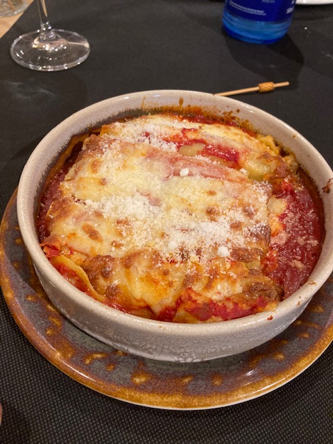 Seguimos con un Carbonara tradicional, que como ya sabemos está elaborada con guanchiale huevo y pimienta. Últimamente veo muchos restaurantes donde la ofertan, pero siempre que he querido probarla, descubro que en ninguno logran el punto y sabor de la carbonara. En este caso y por cercanía con la que pude probar en Carbone, tengo que decir que era mucho mejor. Tenía el sabor clásico de la pimienta, pero la yema de huevo no estaba ligada con caldo de la cocción ni con el queso, que no se si llevaba, ya que no me sabía ni a Pecorino ni a ningún otro queso del tipo, y que se suelen usar para esta receta. Estaban mucho mejor que los del Carbone sin duda, pero les falta un punto para lograr el sabor de una carbonara autentica. También pude probar fusilli a los cuatro quesos, con Gorgonzola, Grana Padano y Provola, muy ricos y sabrosos, con un equilibrio muy bueno. También los canelones de carne, muy ricos, con un intenso sabor a la salsa de tomate y sin bechamel, lo que ayuda a diferenciarla de una lasaña. Los canelones suelen estar bastante «maltratados» en otros restaurante, con salsa a borbotones o una pasta de carne de extraño aspecto, pero en este caso me llamaron la atención porque estaban realmente bien.
