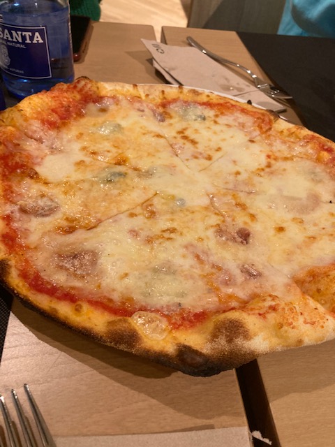 En cuanto a la pizzas, probamos dos, la cuatro quesos con Mozzarrella, Gorgonzola, Taleggio y Grana Padano, muy rica, y la piadina, pizza doblada sobre si misma, con Mozzarella, jamón de Parma, rúcula y aceite de trufa. Me gusto especialmente. Una combinación siempre ganadora, hojas verdes, una buena base de queso y tomate, con el toque de aceite y con el jamón de Parma. Entiendo que el nombre le viene de su parecido a la piadina tradicional, que es un pan hojaldrado típico de Emilia-Romaña, que se rellena con productos como si de una pizza se tratase.
