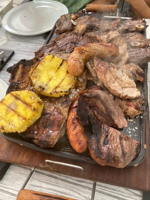 El resultado fue bastante decepcionante. En carta la parrilla constaba de brocheta de pollo, picaña, bistec, costilla de cerdo, chorizo, chorizo criollo, matachana y churrasco, todo ello acompañado de patatas. Pues os cuento, empezando porque lo que nos sirvieron no era lo que describía la carta. ya que de mano a simple vista faltaba la matachana, que reclamamos. La brocheta no la vimos por ningún sitio, entendimos que serían unos trozos de pollo que había (no dijimos nada). Las carnes «pre-cocinadas» tipo costilla o churrasco, correctas, pero las frescas estaban totalmente crudas, no al punto, CRUDAS. El chorizo normal, tampoco lo vimos, había dos criollos eso sí, pero también medio crudos. Pedimos que nos pasaran unas cuantas cosas, porque el calor de la bandeja donde lo sirven, no daba para terminar de hacer todo. Cuando lo devolvieron estaba carbonizado, y cuando digo carbonizado, me refiero a literalmente. Las patatas eran una ración escasa de acompañamiento para toda la parrilla, de patatas congeladas.