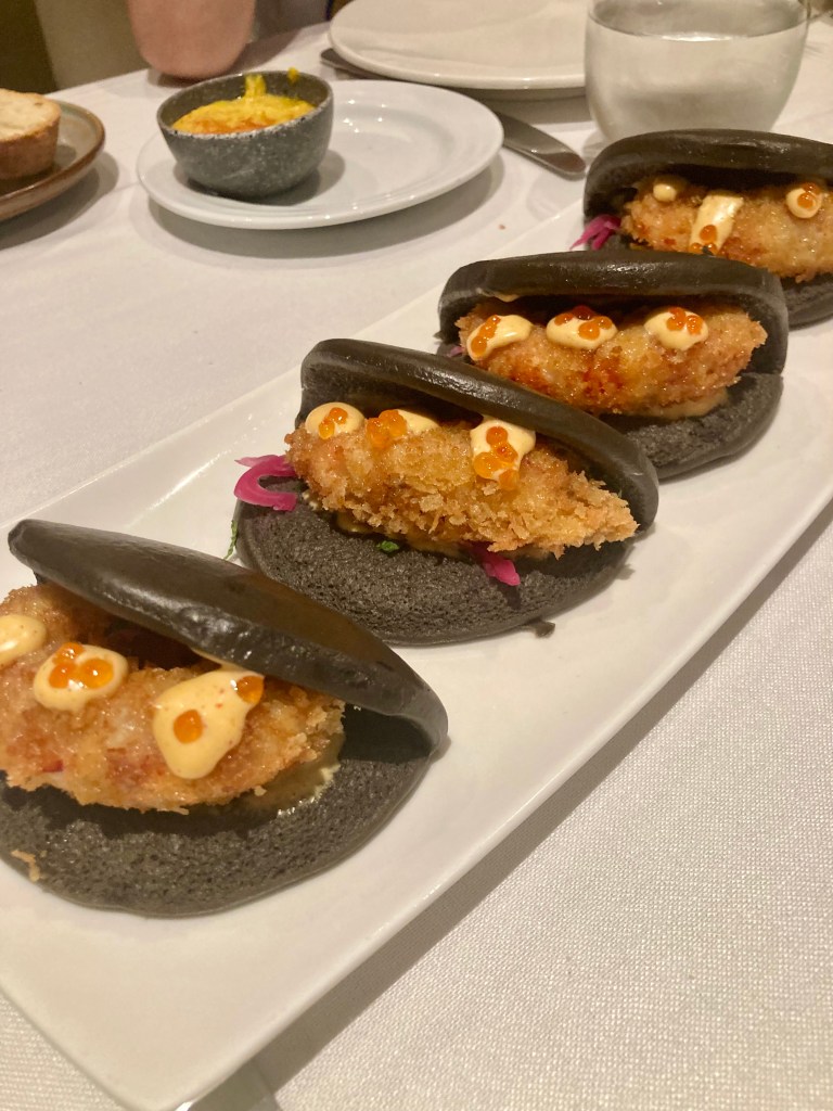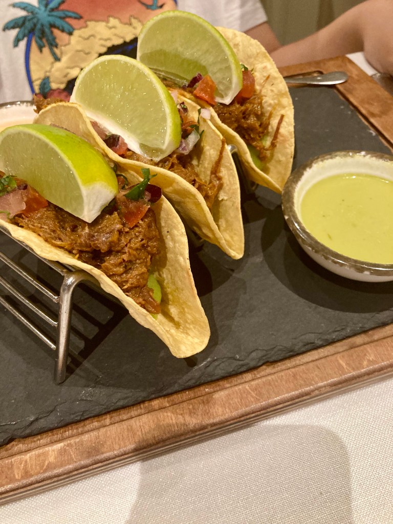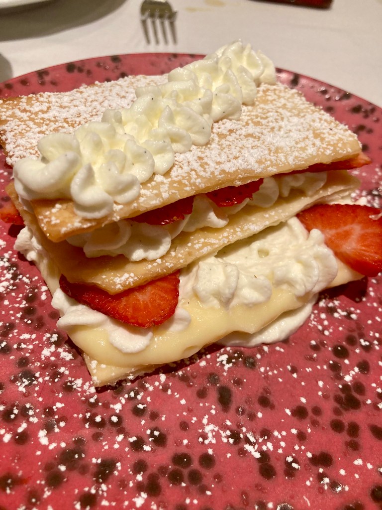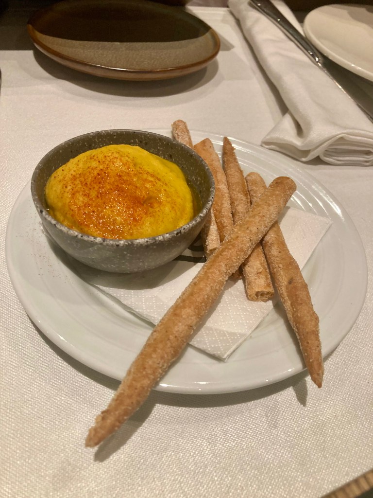 Nosotros en nuestra visita empezamos con un aperitivo de la casa, un humus con pimentón y unos sticks de pan para dipear. De entrante, para compartir pedimos unos baos de gambón, mayokimchi y aromáticas. Nada del otro mundo, ricos. Como plato principal opte por el magret de pato con tartaleta de chirivía, foie, pera al vino y su jugo. Muy rico si bien la tartaleta estaba un poco quemada, pero rico. Del resto de los comensales pude probar la lubina de Bustamante en escabeche de mango con toque de aji amarillo y verduritas de temporada, personalmente un chof absoluto, unos tacos mexicanos de ternera con achiote de Albert y Juan de Master Chef Junior, correctos pero nada excepcionales, y el solomillo con salsa de mostaza antigua y verduras de temporada salteadas de Silvia Abril, rico. De postre optamos por dos diferentes para compartir, la tarta de Chocolate de David Pallás, una tarta de chocolate, que como novedad tiene petazetas por encima, rica pero nada fuera de lo normal. Y las milhojas de fresas con chantilly avainillada de Samantha, que contrariamente a lo que pudiera parecer no estaba bueno. No se que le fallaba pero algo no estaba correcto en el plato. Por la noche estuve algo malo del estomago y no quisiera achacarlo a esto, pero tenia la sensación de que algo no encajaba en el postre.