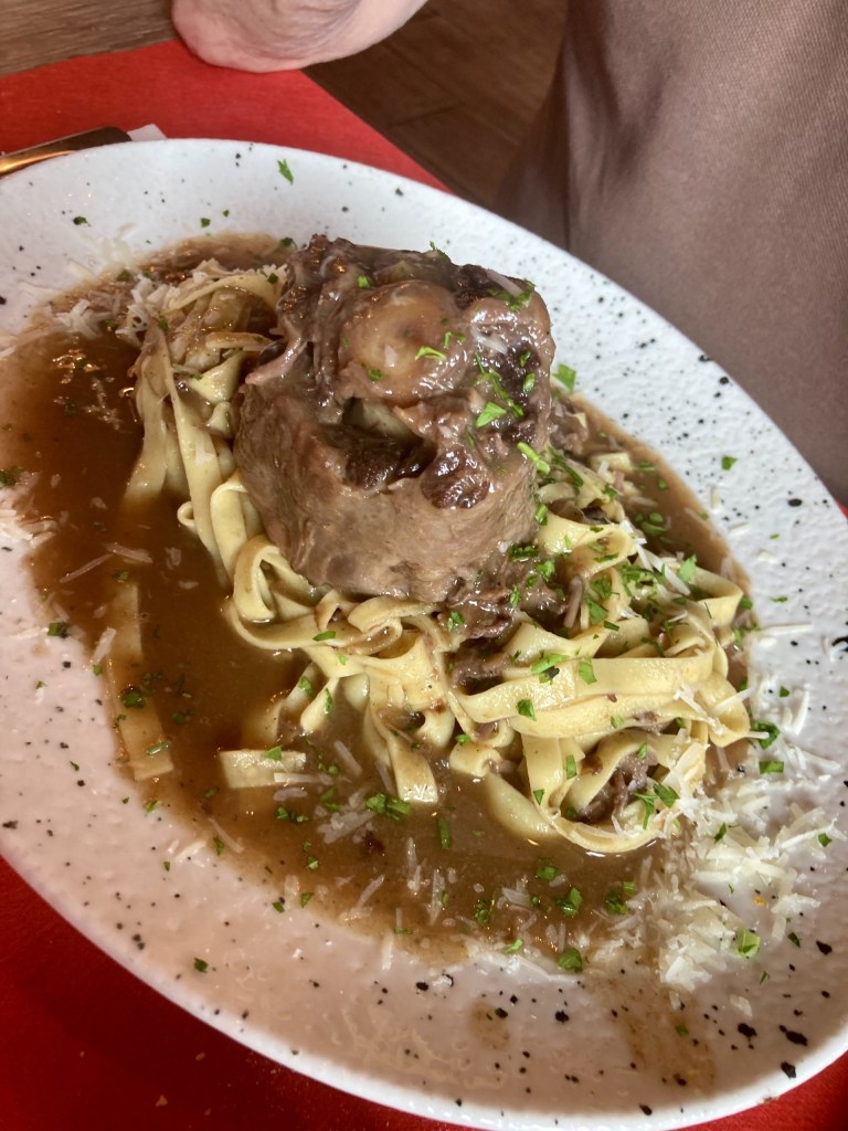 Para comer opté por una de las recomendaciones del chef, el polpette al sugo, es decir unas albóndigas en salsa, acompañadas de unos tallarines frescos. Combinación muy rica y sabrosa. Otro plato recomendado y que pude probar fue la pasta fresca con rabo de vaca. En principio puede resultar algo engorroso, ya que hay que limpiar el hueso de toda la carne, y es algo que a mi personalmente no me gusta (por eso nunca pido, por ejemplo, pasta frutti di mare, por no estar pelando gambas o mejillones para cada bocado que das) Personalmente me gusta la pasta que puedes comer sin parar a «despiezar», disfrutando del conjunto. En este caso el resultado es bueno, una rica carne, con la pasta es una apuesta segura. De la carta habitual pude probar unos gnocchi alla sorrentina, unos ricos ñoquis con salsa de tomate y gratinados al horno, muy ricos, así como los spaghetti carbonara, que ofrecen en versión con o sin nata. En esta ocasión con nata, y no me convencieron. Creo que la carbonara hay que servirla como es, y si lo que quieres es una versión con nata, yo ofrecería una «carbonata», es decir, un plato en el que usaríamos bacón que resulta más suave. En este plato el guachialle resultaba demasiado intenso, y la nata al ser muy suave no contrarrestaba el sabor de este.