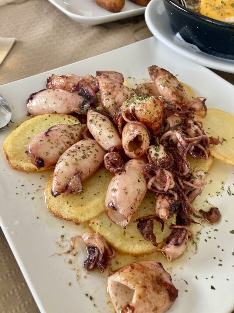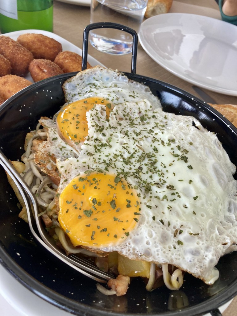 Cocina casera y tradicional, como sabéis, y disfrutando de su terraza, en esta visita pudimos probar como novedad la cazuela de la casa, con gulas, huevos, patatas y gambas, un clásico muy rico e ideal para compartir. lástima de huevos, que no tuvieran la yema liquida.