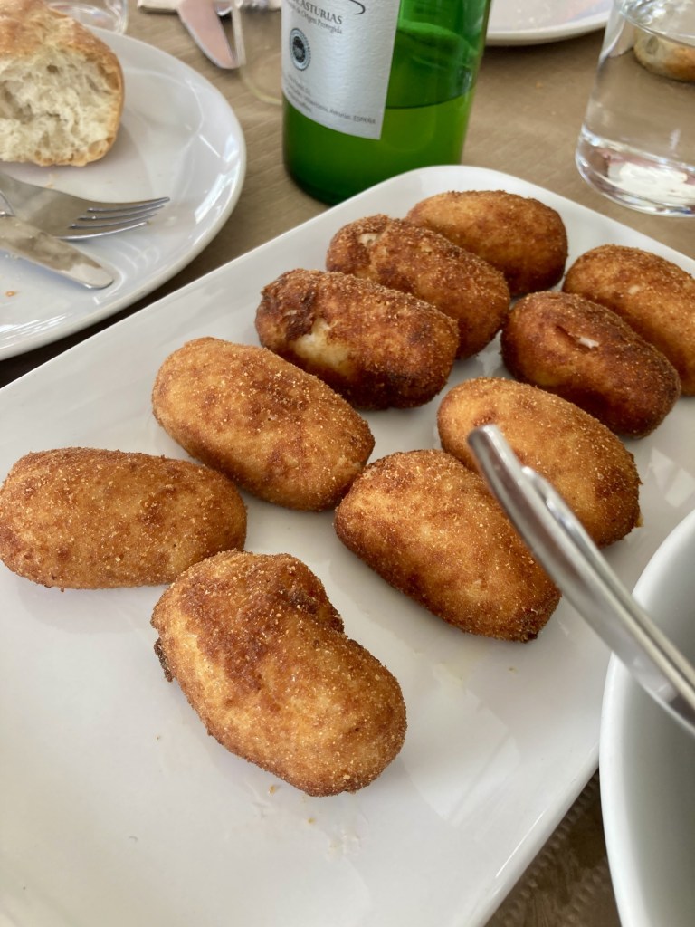 No pudimos evitar pedir nuevamente el cachopo de setas, que tan buen recuerdo guardábamos de él, así como las croquetas y los chipirones, que también conocíamos y que resultan unos básicos para compartir. También como novedad optamos por un cachopo tradicional. Buena opción y buen resultado, abundante, y logrado, acompañado de patatas estaba bastante rico. En cuanto a los postres, una sencilla pero rica tarta de la abuela, casera y un arroz con leche requemado muy rico también. Acompañado de agua y sidra Frutos de DO, el precio fue de unos 152 €.