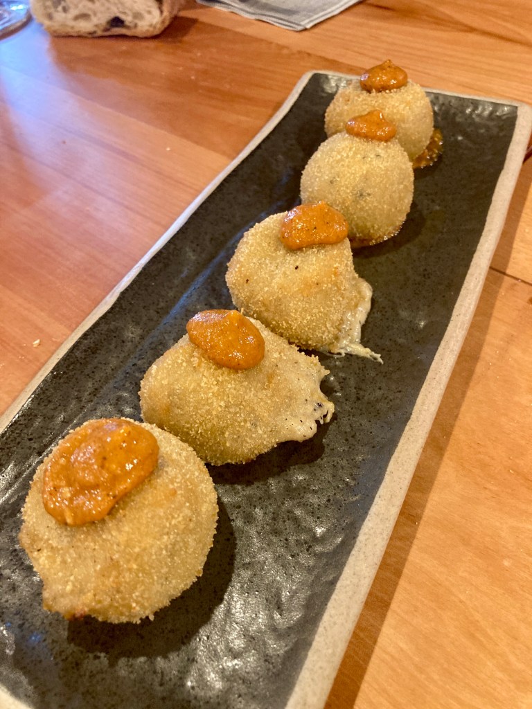 Nosotros empezamos por unas alcachofas a la brasa con ajoblanco de pistacho y vinagre de frambuesa. A 6,50 € la unidad. Ricas, pero el ajoblanco no se aprecia y el vinagre de frambuesa no lo aprecie en nada. Continuamos con unas croquetas de puerro con salsa romesco, ricas con ese gusto sabroso que tiene el puerro.