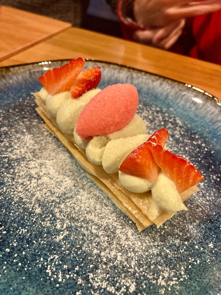 Como plato principal personalmente compartí un arroz de montaña con secreto ibérico y alioli de ajo asado. Correcto, aunque me esperaba un sabor más intenso. En cuanto a los postres os puedo hablar de tres, la milhoja de pistacho, la tarta de queso y lo que denominan todo chocolate que es básicamente una presentación de chocolate en diferentes tipos y texturas. Ninguno de ellos de interés. Por el precio que tienen te esperas otra cosa, postres francamente mejorables.