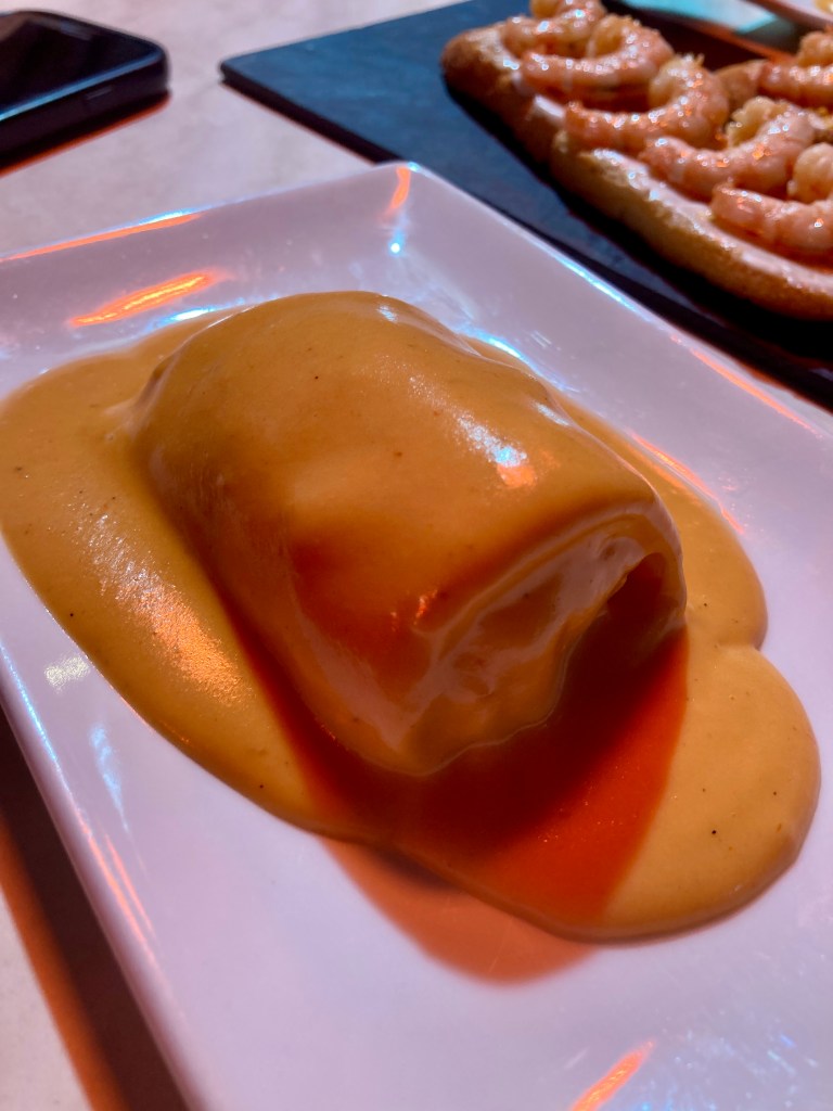 Seguimos con Obama en la Casa Blanca, servido en un cuenco que recuerda la cúpula del Congreso estadounidense. Lleva una base de hojaldre, crema de champiñones, huevo trufado a baja temperatura y patatas deshidratadas con tinta de calamar. También probamos Pata Negra, un montadito sencillo pero delicioso con magreta de cerdo, pan de leche, mozzarella trufada y mostaza.