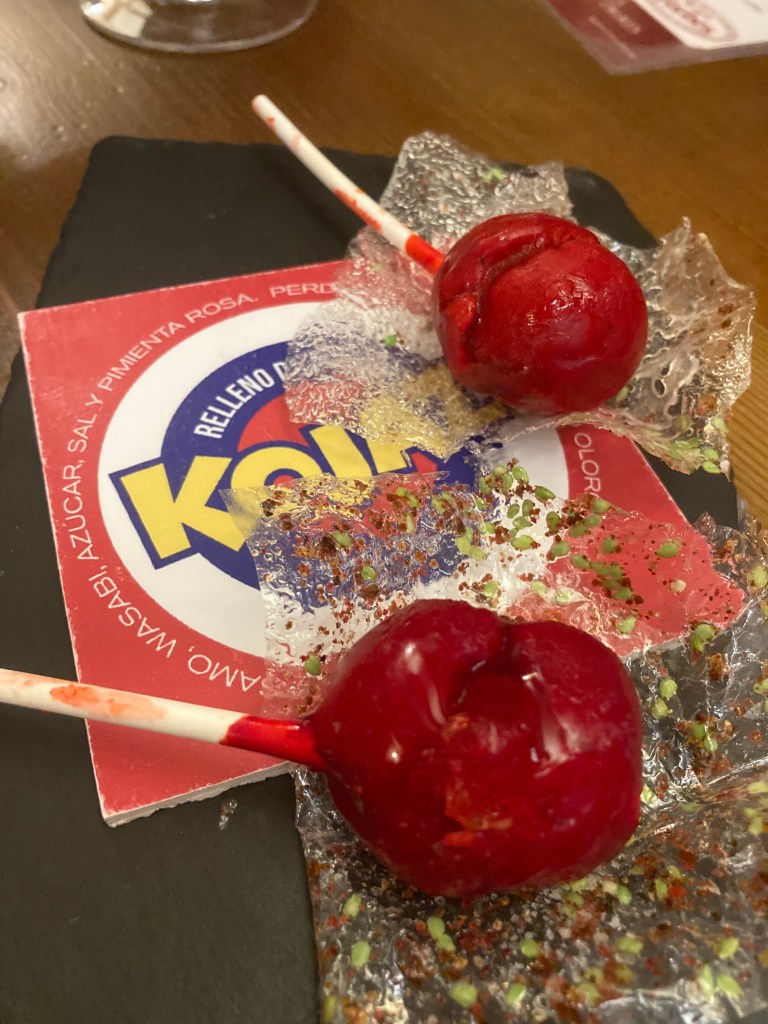 Uno de los pinchos más sorprendentes fue La Velada Perfecta, que llega a la mesa simulando una vela encendida. Está hecha de pollo de corral en pepitoria, con manzana, pistacho y una cobertura de chocolate blanco. Fue premiado con el Pincho de Oro en 2020. Y para cerrar con broche de oro, el Kojaz, un chupa-chups de perdiz con esfera de vino oloroso que recuerda a los caramelos Kojak. Esta creación ganó el segundo premio en el concurso nacional de tapas de 2024.