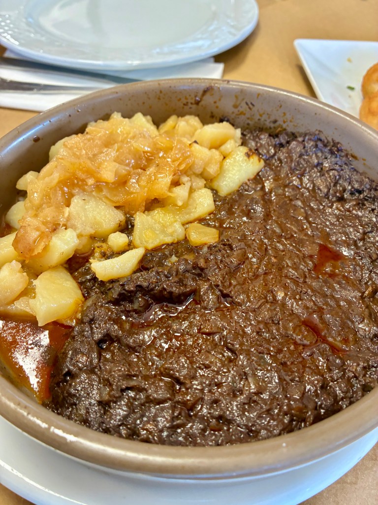 Probamos también una morcilla matachana con patatas y cebolla caramelizada, muy sabrosa, bien presentada y con el dulzor justo. Las patatas al cabrales son de tamaño generoso, quizá demasiado: unas patatas algo más pequeñas serían más cómodas de disfrutar, pero el sabor es contundente y equilibrado.