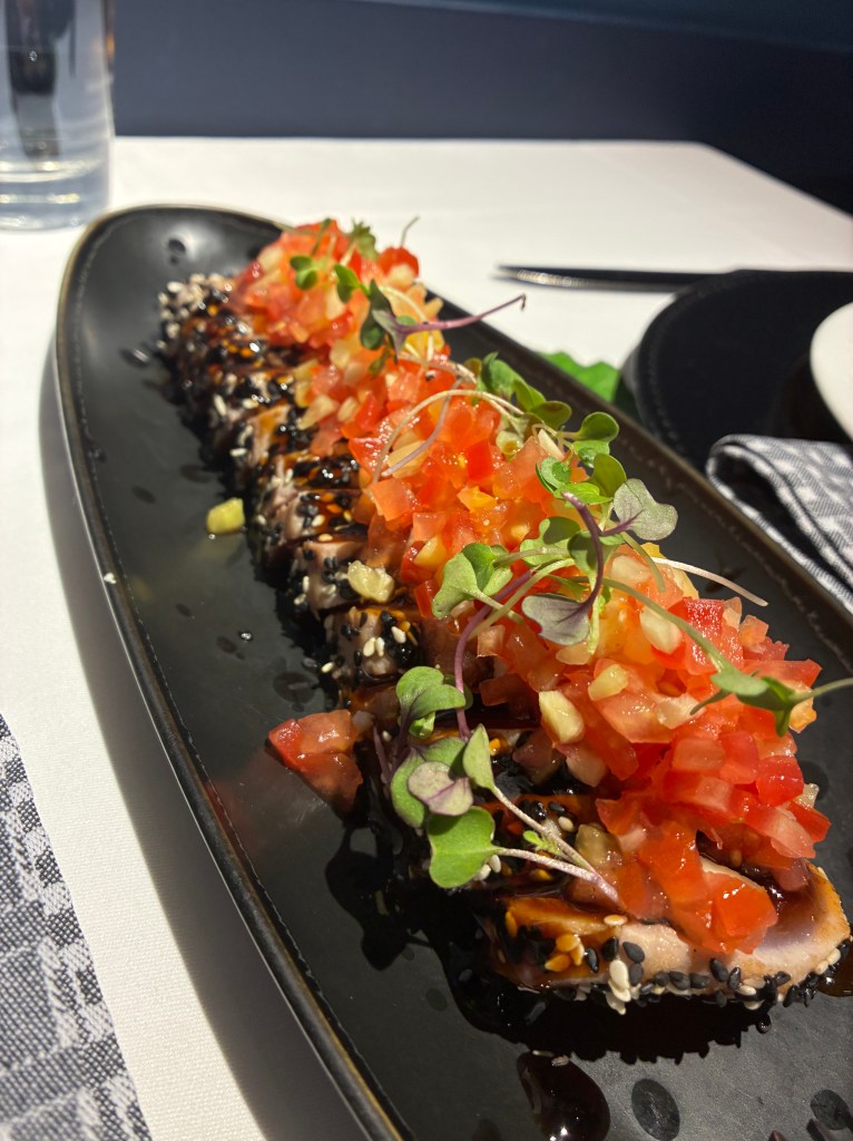 En esta ocasión empezamos por el tataki de atún con brunoise de tomate y piña, ponzu y salsa kimchie. Perfecto punto y combinación de sabores. Muy rico. Continuamos con unos tacos de ragú de jabalí con alga wakame y salsa thai. Ricos aunque la intensidad de sabor de la carne tapa bastante al resto de ingredientes. Para terminar unos canelones de pitu caleya, gratinados, muy ricos. Como toque final un delicioso coulant de chocolate con helado de casatta, perfecto en ejecución y sabores.