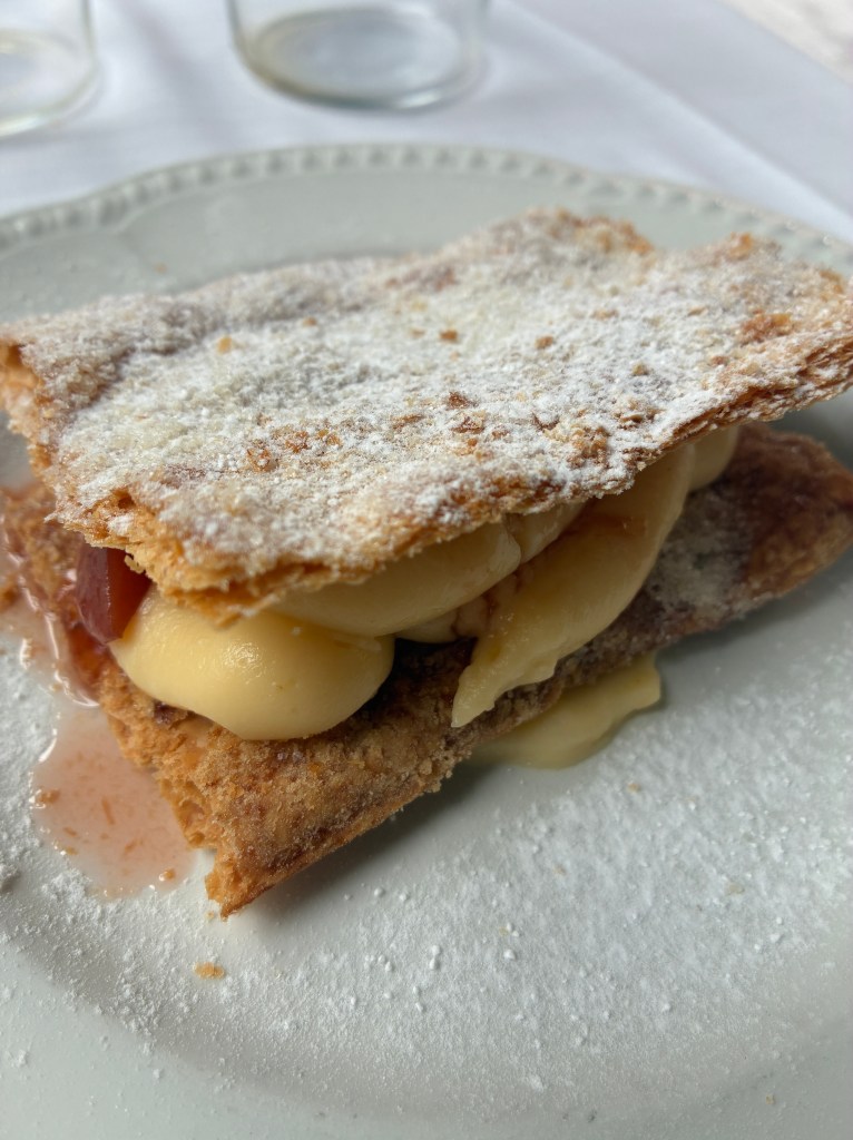 El broche final lo puso una milhojas de postre, ligera y bien presentada, que aportó un toque dulce y equilibrado al cierre de la comida. Todo ello acompañado con sidra DOP, con escanciador electrónico, que ayudó a redondear la experiencia. La cuenta final fue de unos 108 € para dos personas, un precio que refleja tanto la calidad del producto como la ubicación y el prestigio del local.
