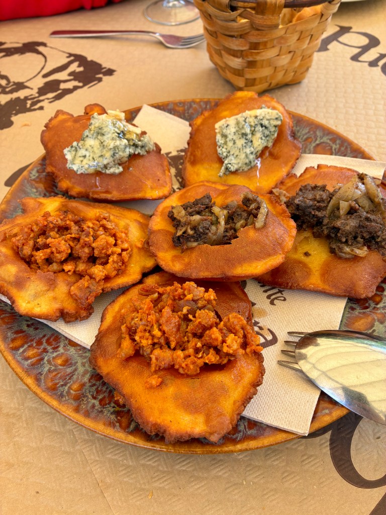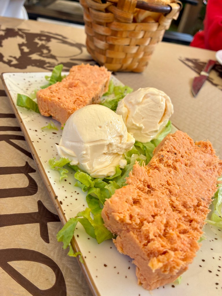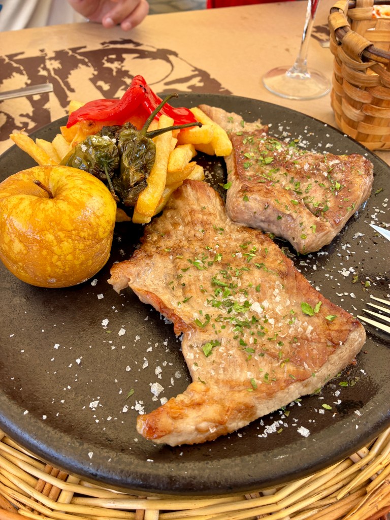En nuestra visita comenzamos con un variado de tortos que incluía dos de cabrales con miel, dos de matachana y dos de picadillo. Todos resultaron sabrosos y bien elaborados. A continuación, probamos un clásico pastel de cabracho, muy correcto en sabor y textura. Para los segundos, compartimos un cachopo y un secreto ibérico. El cachopo, de relleno clásico pero con el añadido de espárrago y pimiento, nos sorprendió gratamente: no es mi combinación favorita, pero en esta ocasión funcionó muy bien. El secreto, jugoso y bien hecho. De postre, una ración de tarta Charlota casera, muy rica y ligera y un flan de queso muy rico, para rematar la comida.