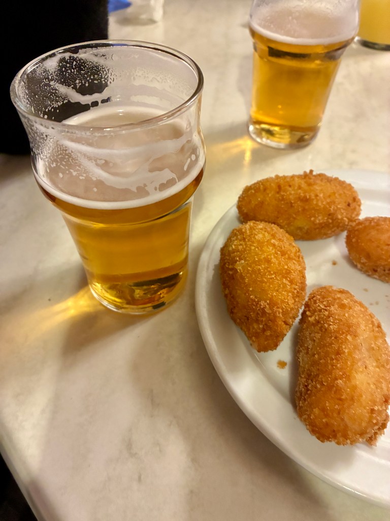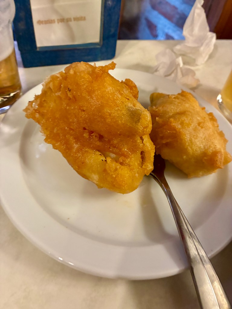 Sin duda, sus dos opciones más famosas y que centran la carta son las croquetas de jamón ibérico y las tajadas de bacalao. Estas últimas me recordaron inevitablemente a unos soldados de Pavía, aunque en versión más generosa y contundente: menos finos, más carnosos y con un rebozado que cruje desde el primer bocado.